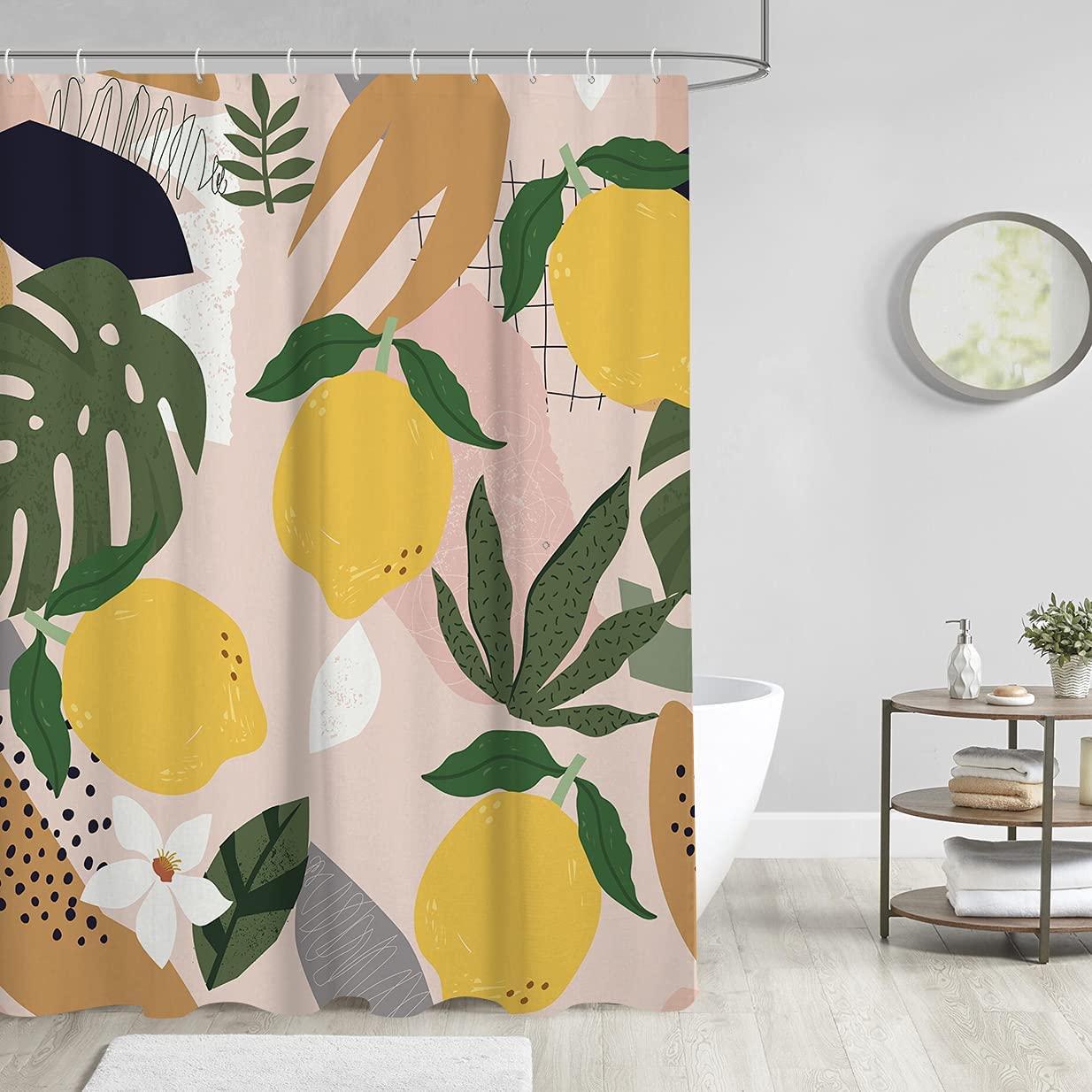 Abstract Lemon Shower Curtain with Tropical Palm Fruit Leaves, Aesthetic Geometric Leaf for Bathroom Decor