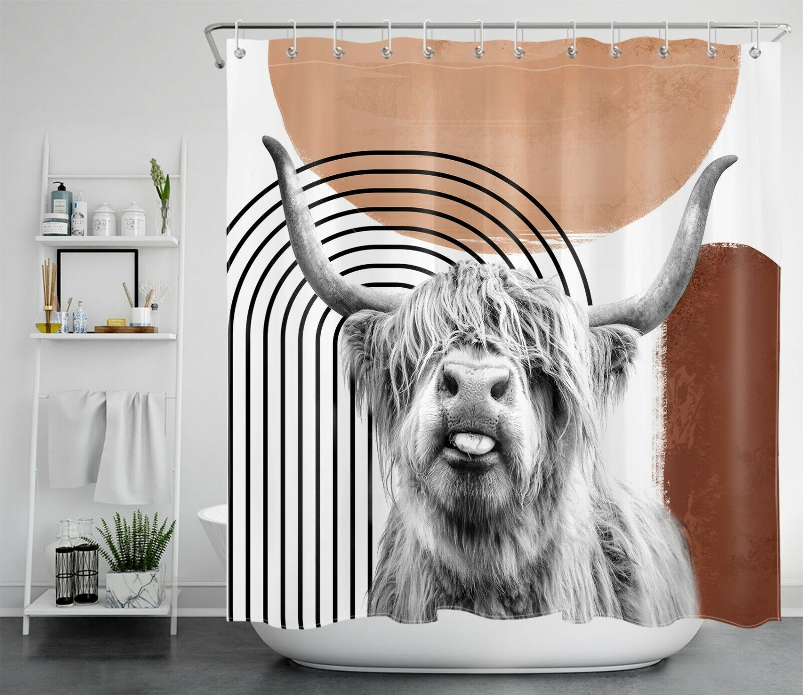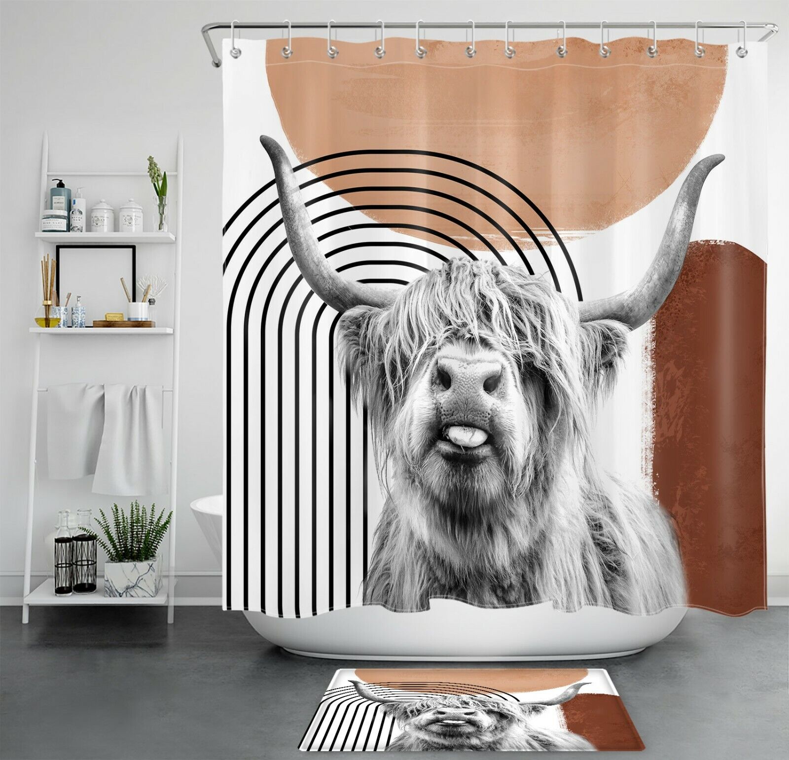 Abstract Mid Century Highland Cow Shower Curtain for Creative Bathroom Decor