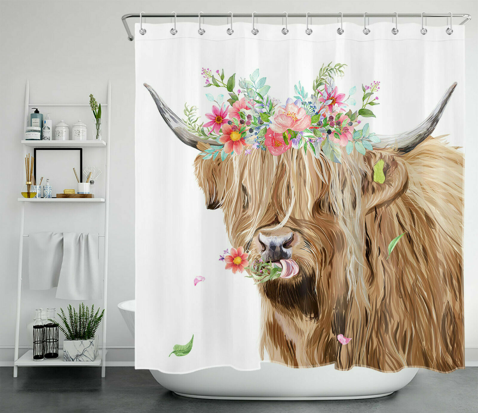 Animal Highland Cow Shower Curtain with Spring Flowers for Bathroom Decor