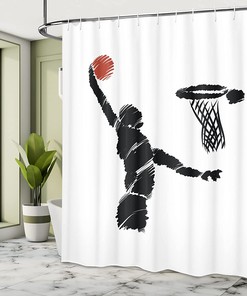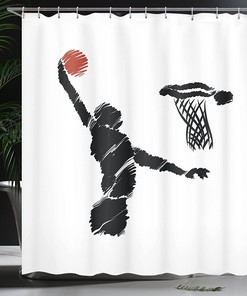 Basketball Shower Curtain, Hand Drawn Basketball Player Jumping Art, Cloth Bathroom Decor W, Cinnamon, Black