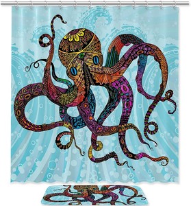 Featuring a captivating blue color scheme, this shower curtain instantly creates a soothing and serene ambiance reminiscent of the sea. The star of the design is the magnificent octopus, beautifully depicted with its swirling tentacles and intricate details. The vivid colors and artistic rendering of the octopus make it a focal point that will catch the eye of anyone entering your bathroom.