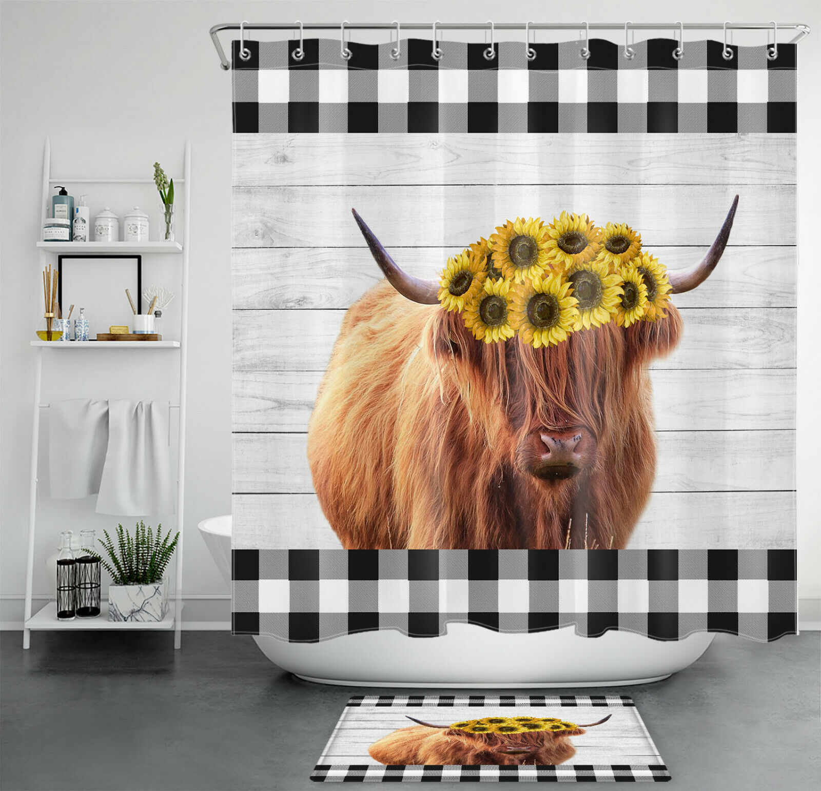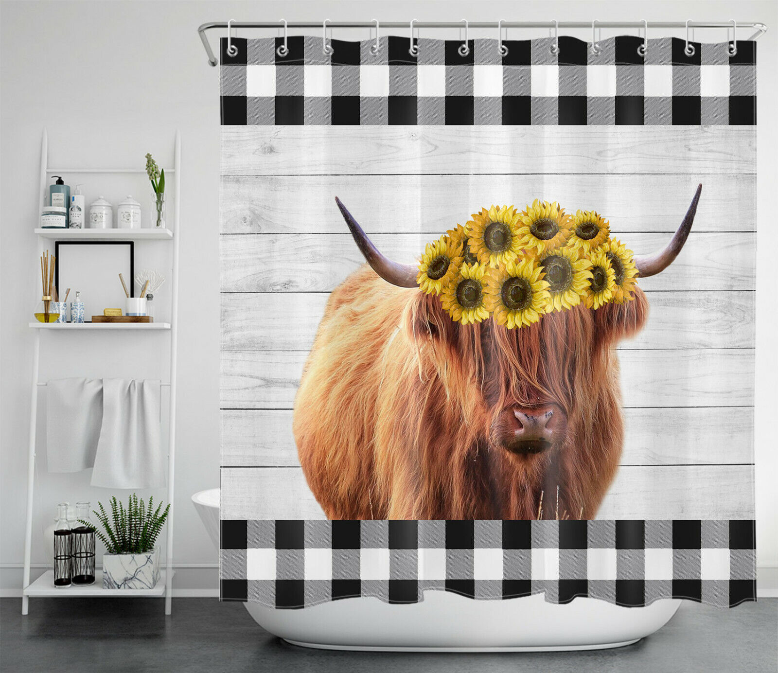 Buffalo Plaid Sunflower Shower Curtain, Highland Cow Farm Bathroom Accessory