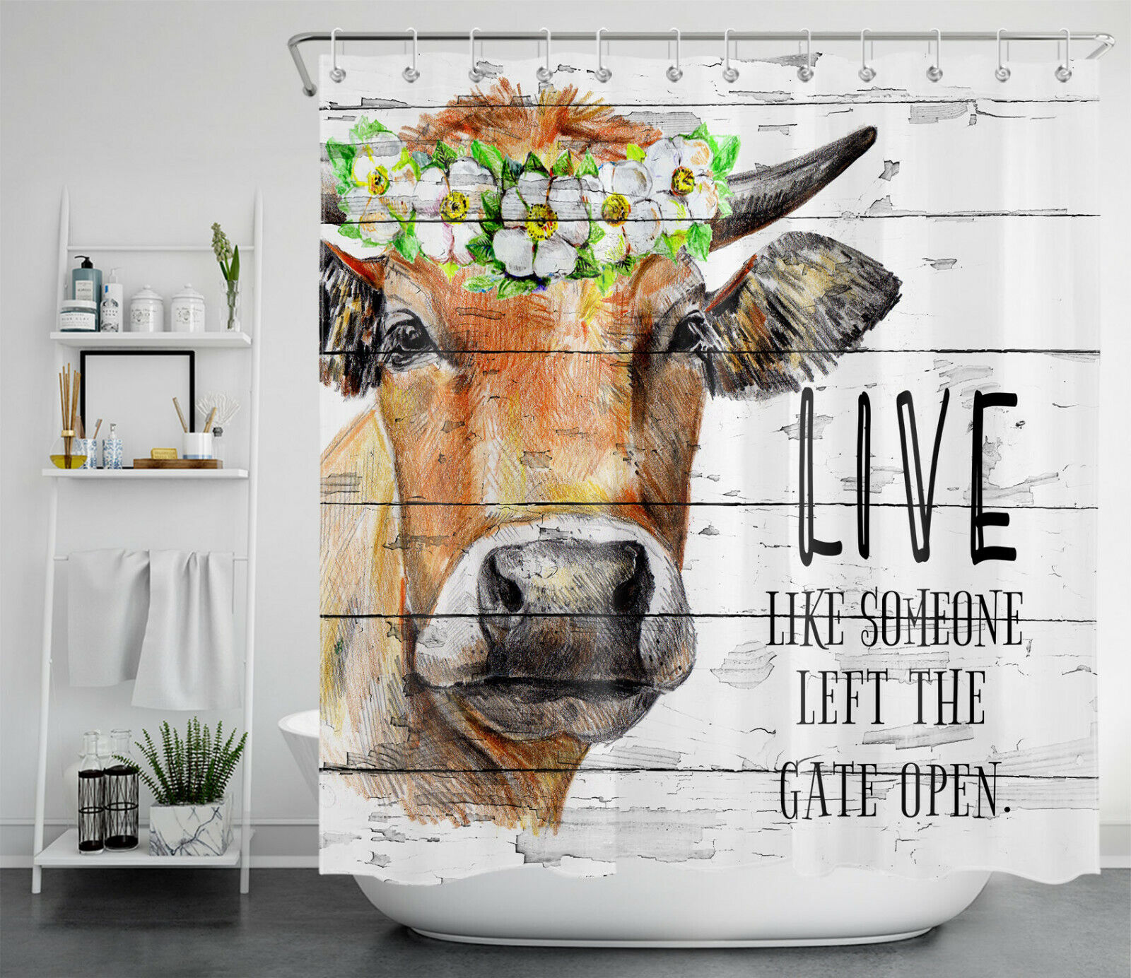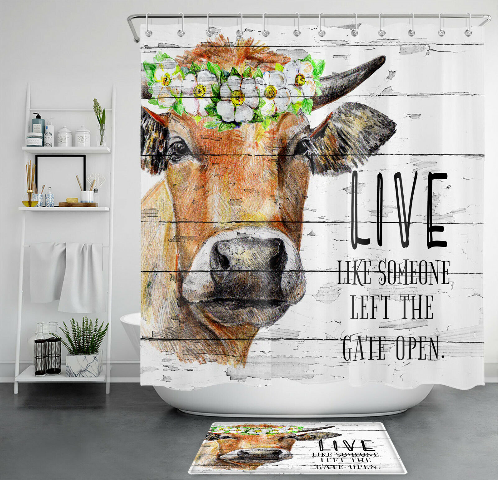 Farm Animal and Flower Shower Curtain – Rustic Planks Bathroom Decor