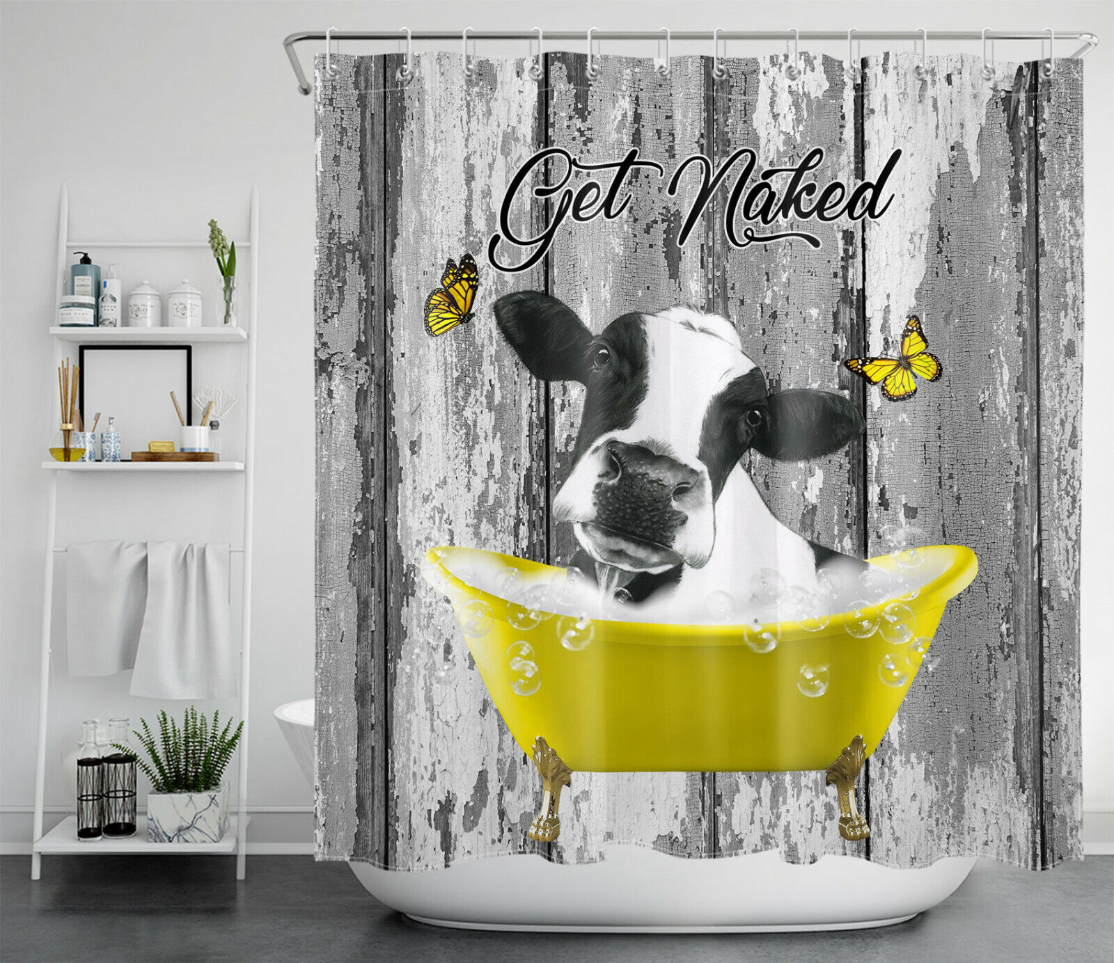 Farmhouse Cow Shower Curtain with Butterfly and Funny Get Naked Theme for Bathroom Decor