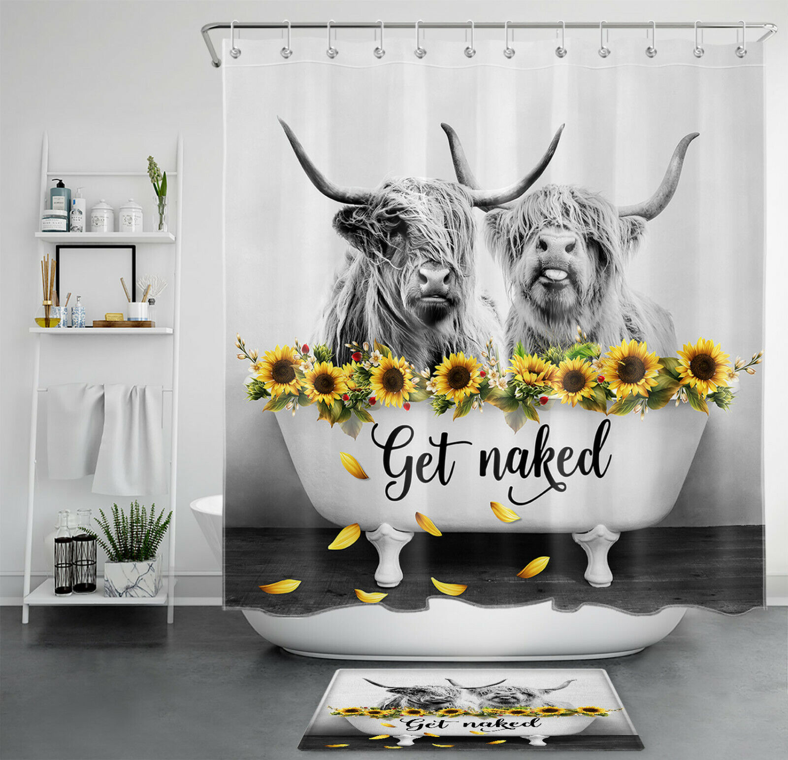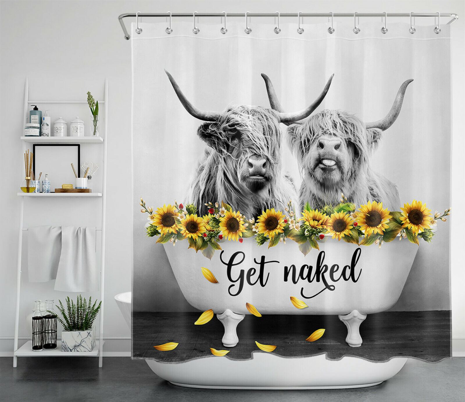 Farmhouse Sunflower Get Naked Shower Curtain, Highland Cow Bathroom Accessory