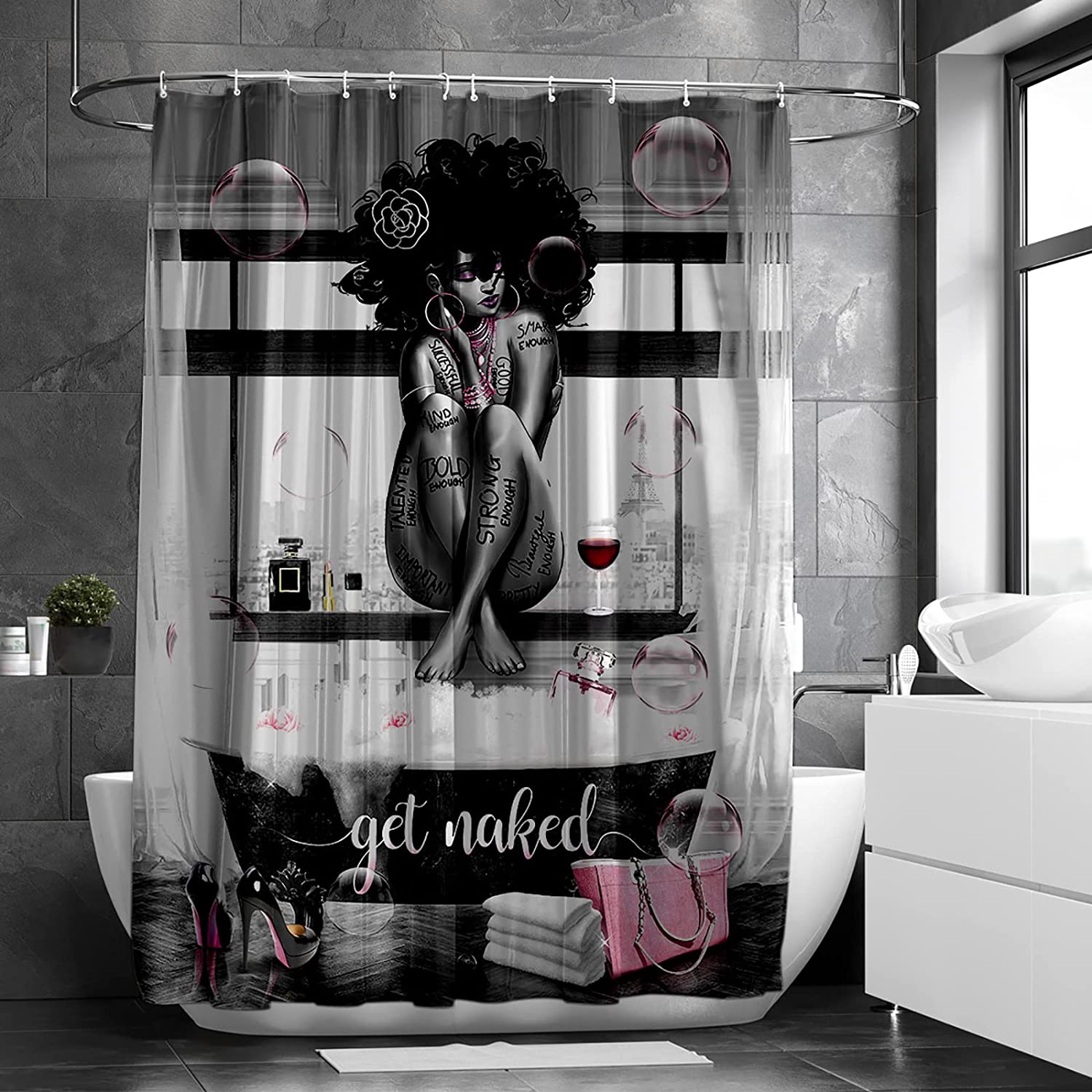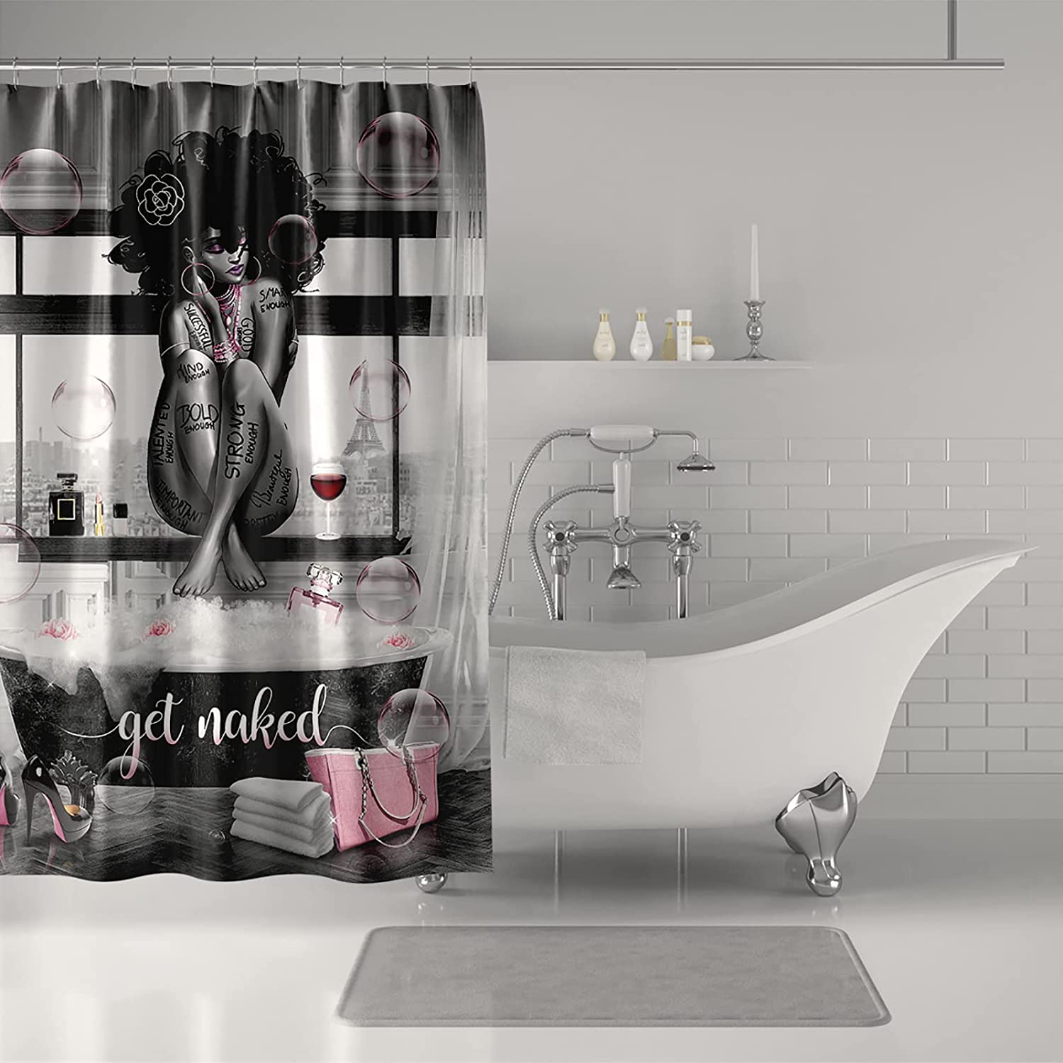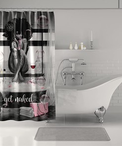 This fashionable African-American shower curtain features a beautiful black girl and bathtub design. The curtain is made of high-quality polyester and is water-resistant, so it is perfect for protecting your bathroom from water damage. The curtain also has a grommet top for easy hanging.