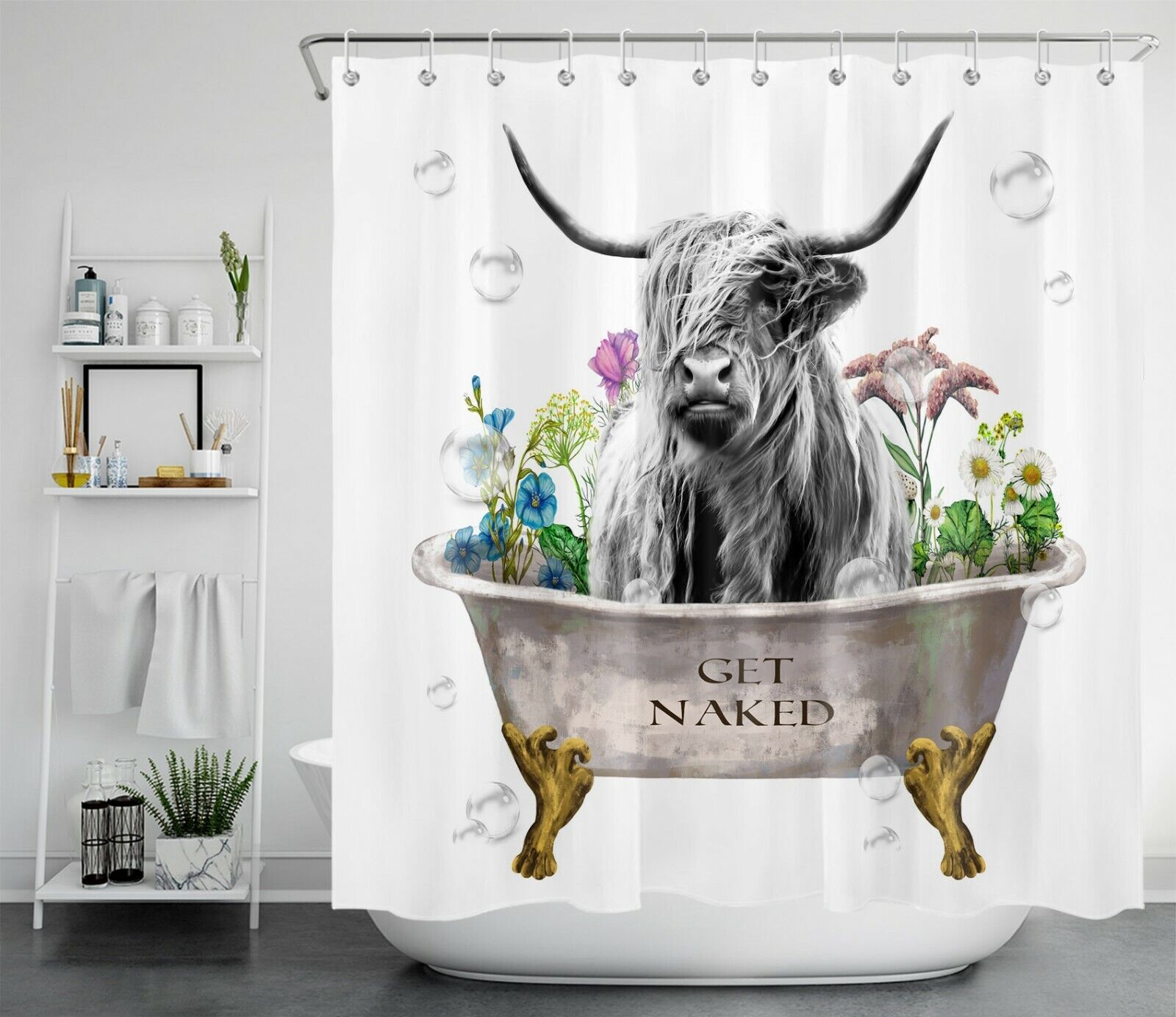 Flower Farmhouse Shower Curtain, Waterproof Bathroom Accessory with Highland Cow