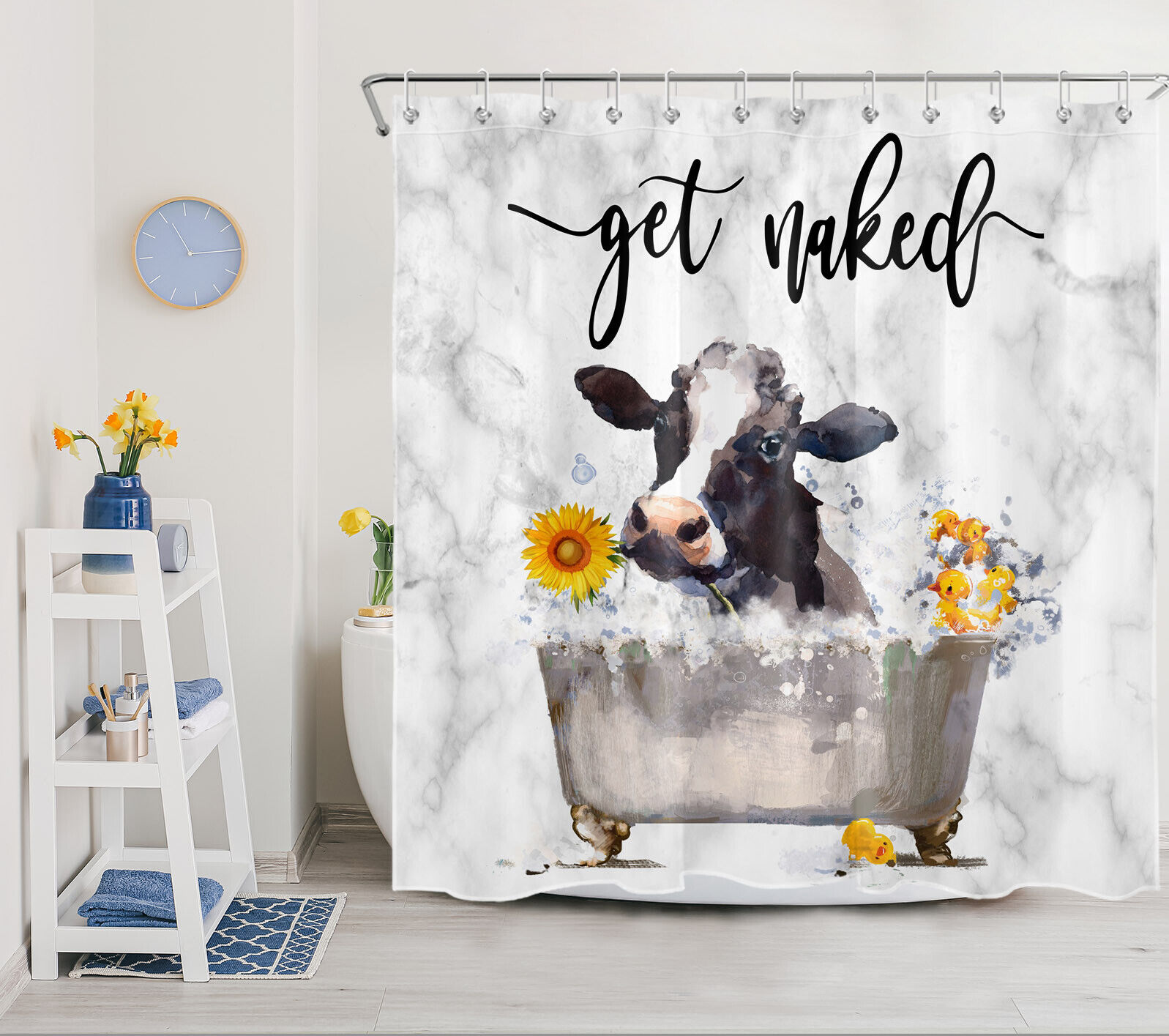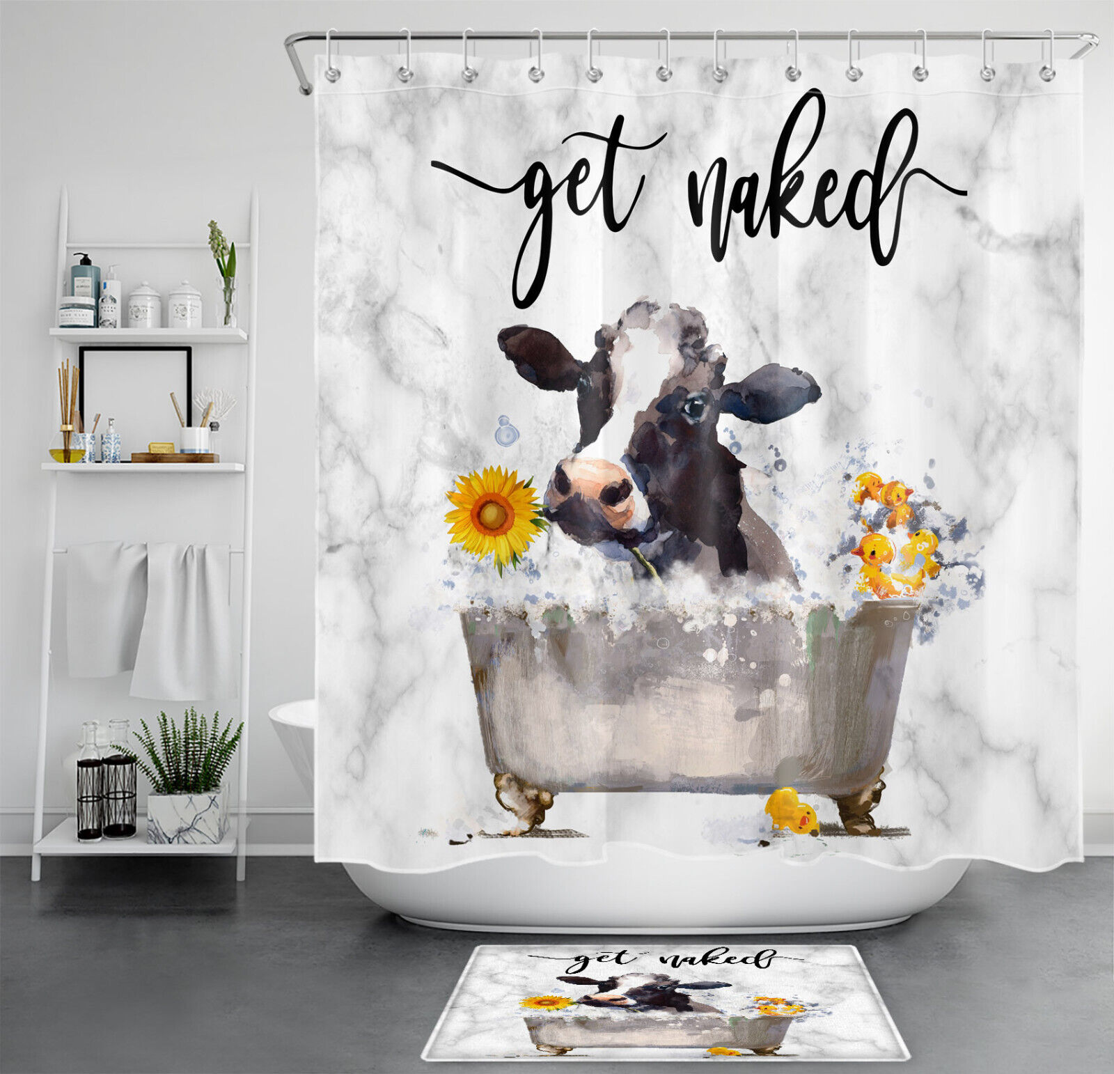 Funny Animal Cow Marble Texture Sunflower Shower Curtain for Bathroom Decor
