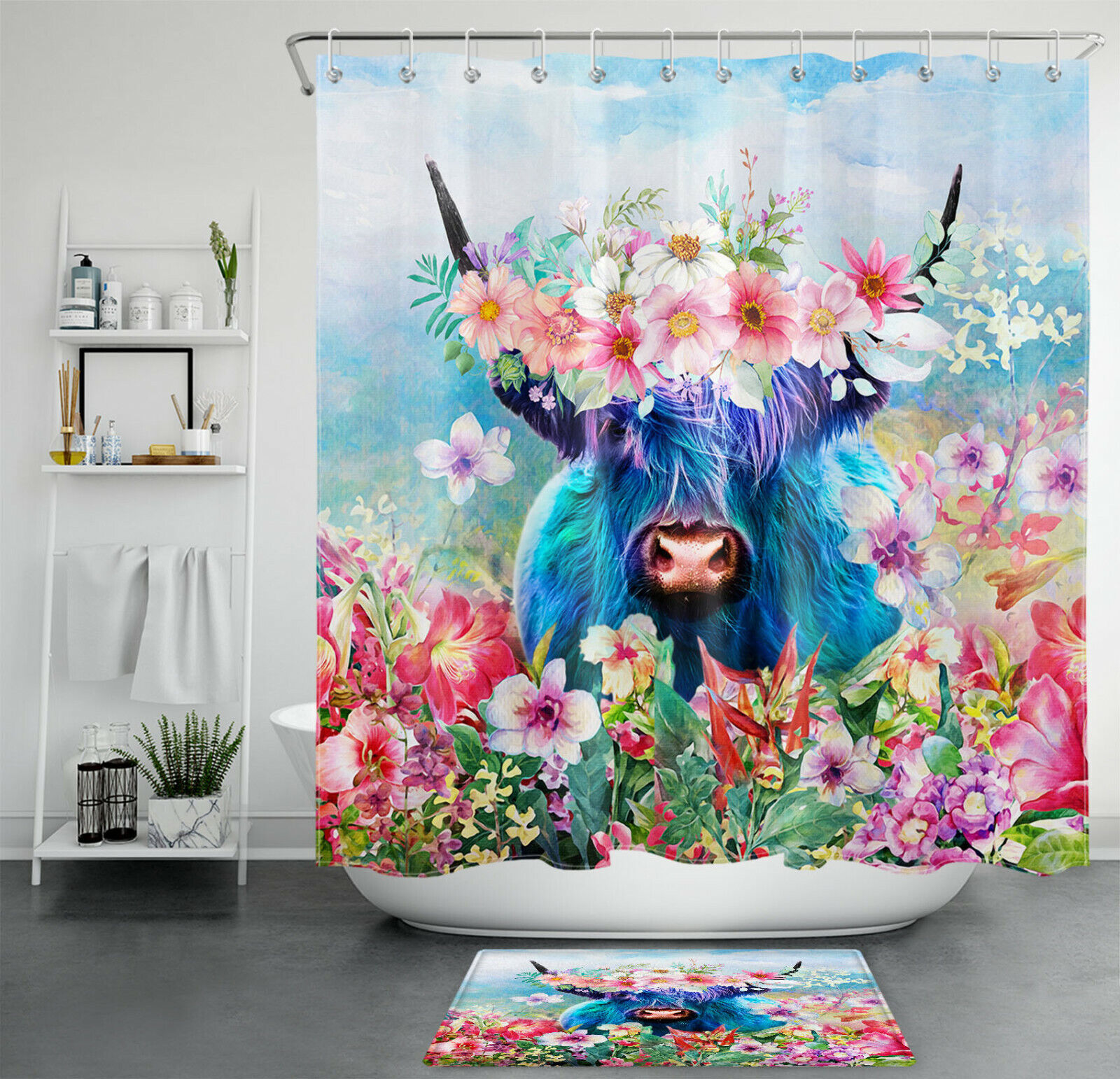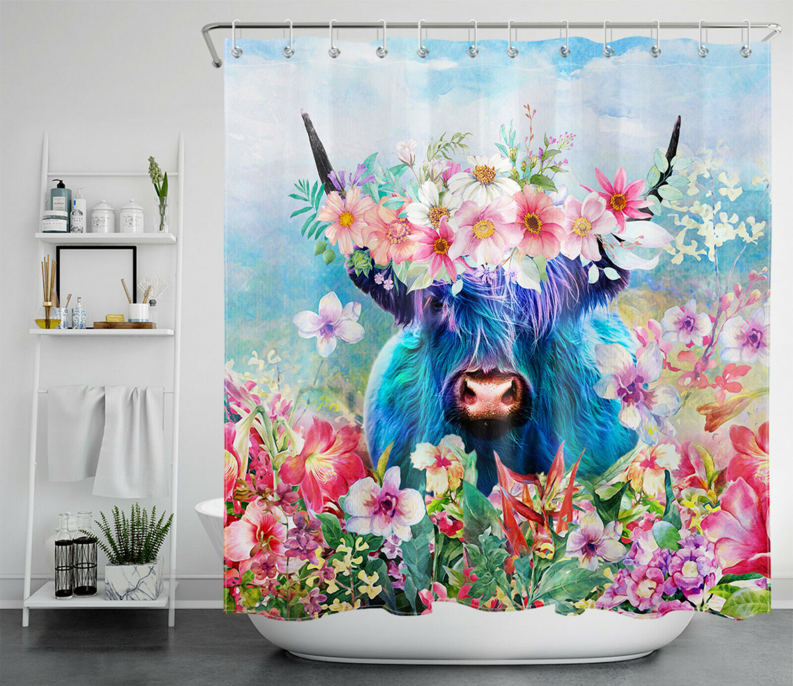 Funny Blue Highland Cow Watercolor Flower Shower Curtain – Bathroom Accessories