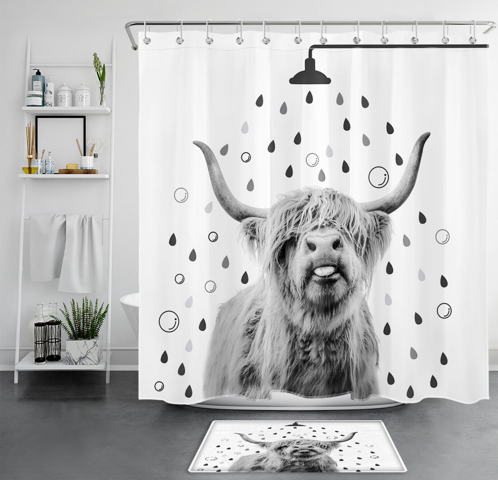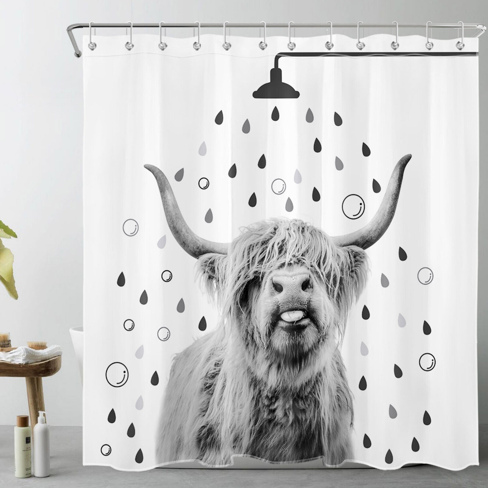 Funny Grey Highland Cow Shower Curtain, Country Style Bathroom Decor