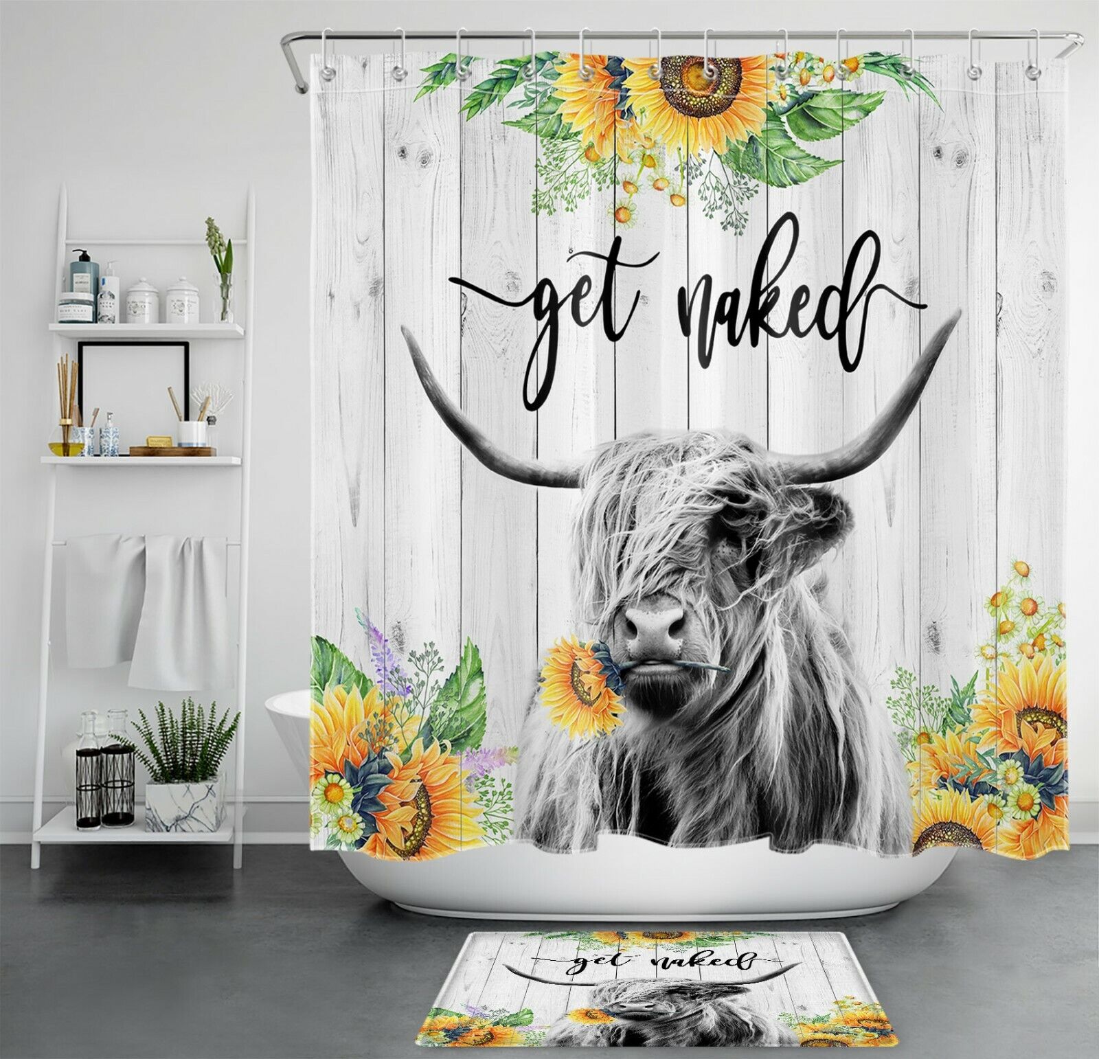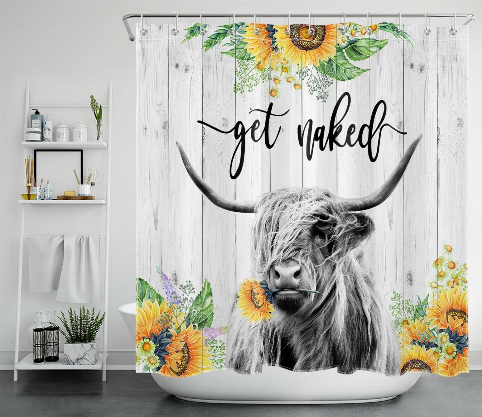 Funny Rustic Word Highland Cow Sunflower Shower Curtain for Bathroom Decor