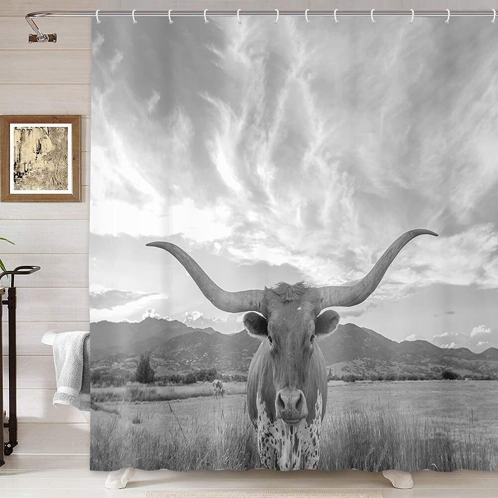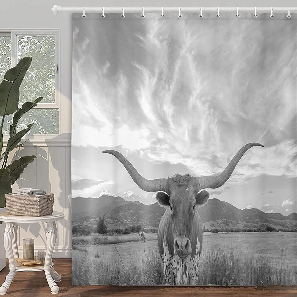 Grey Longhorn Cow Shower Curtain – Rustic Animal Bathroom Decor