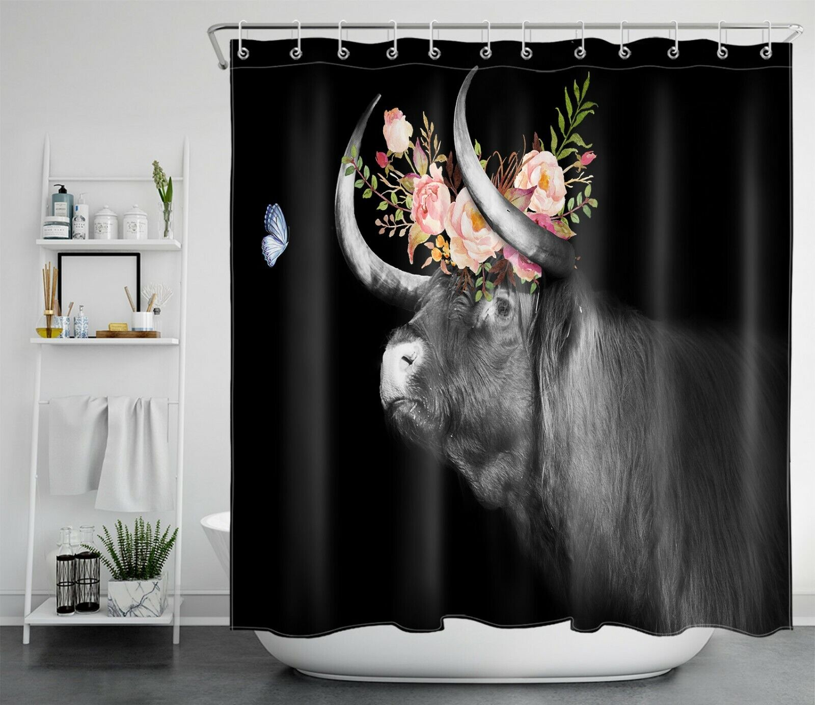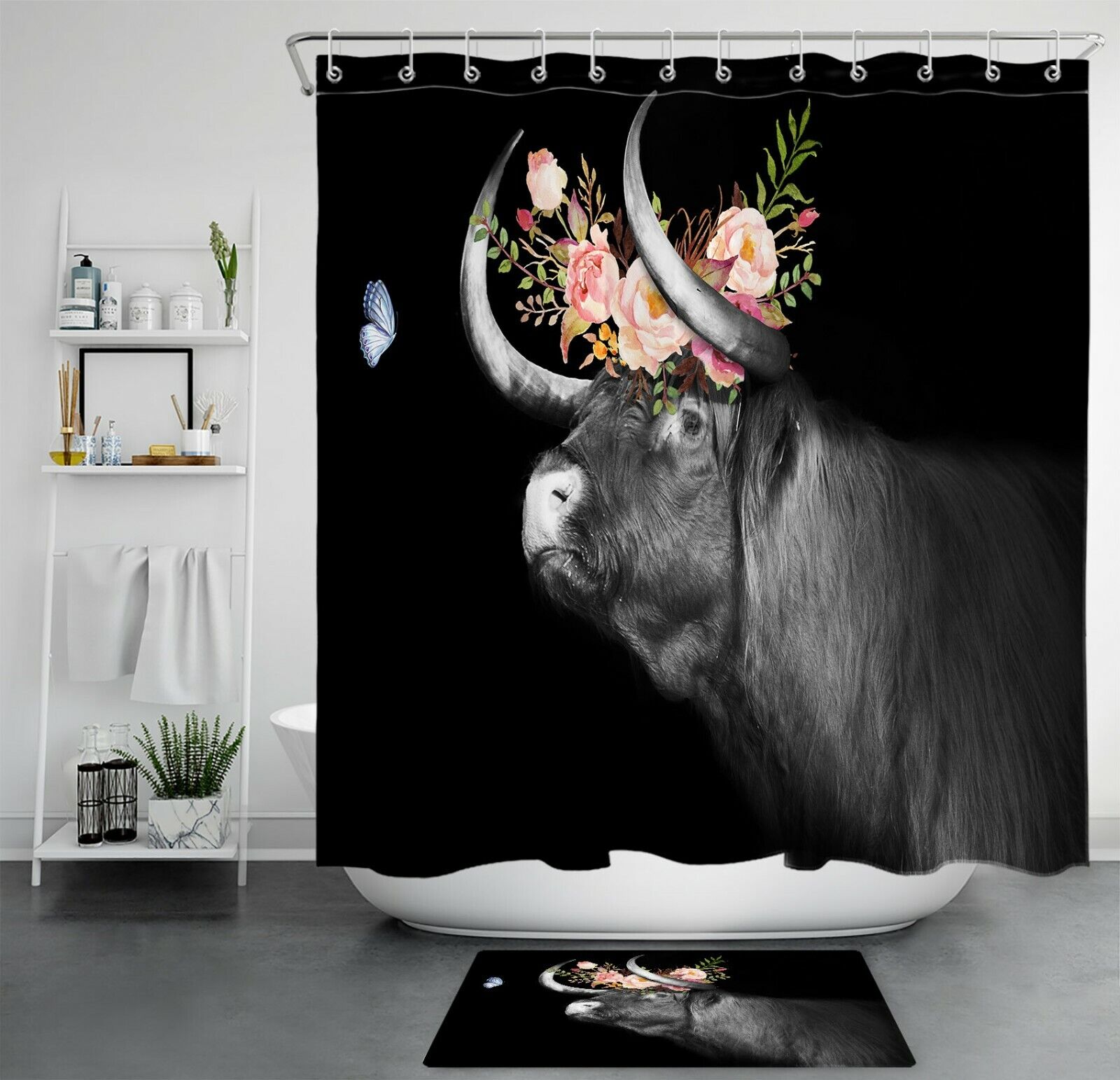 Highland Cow and Butterfly Flower Shower Curtain Set – Rustic Bathroom Accessories