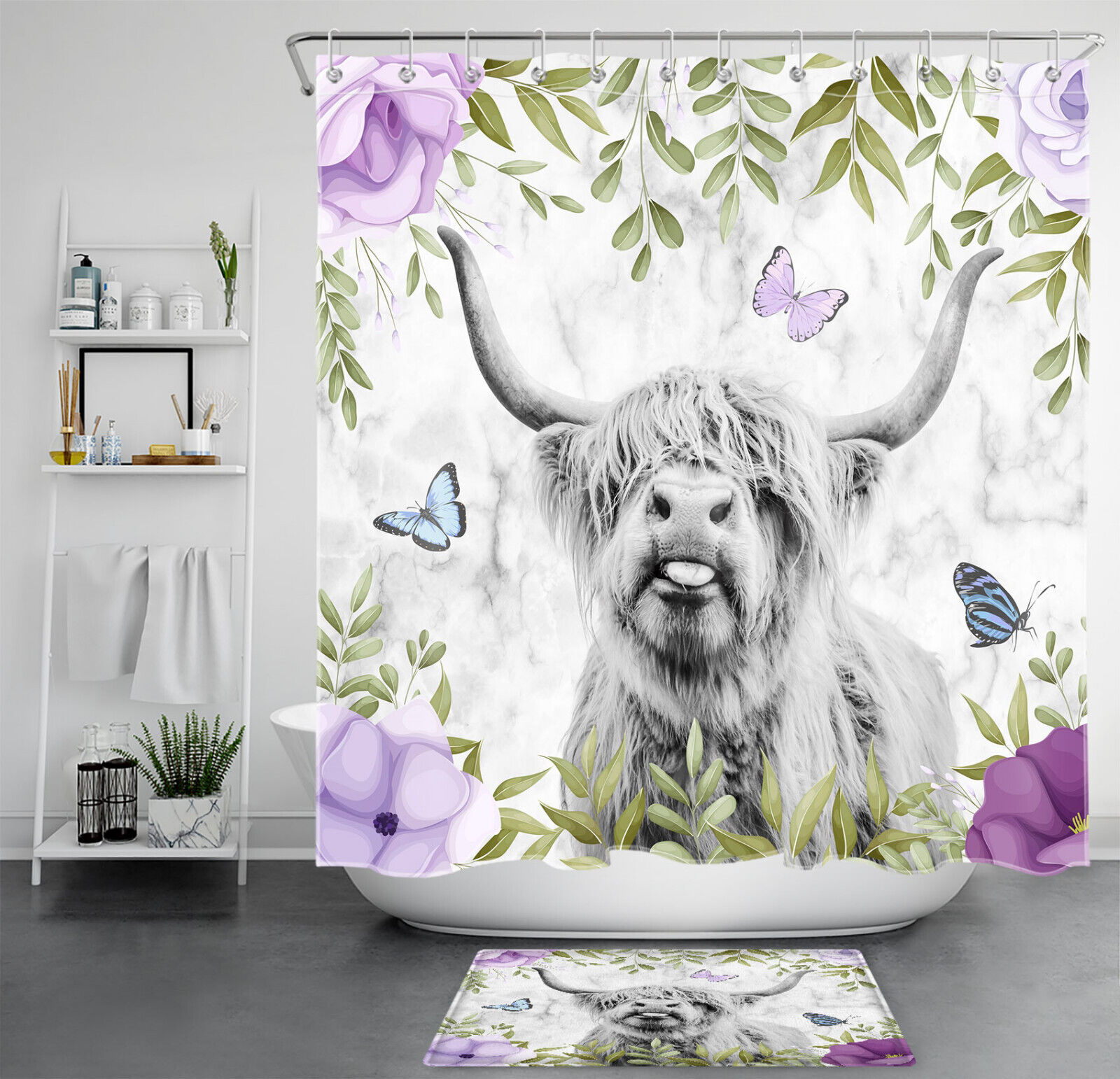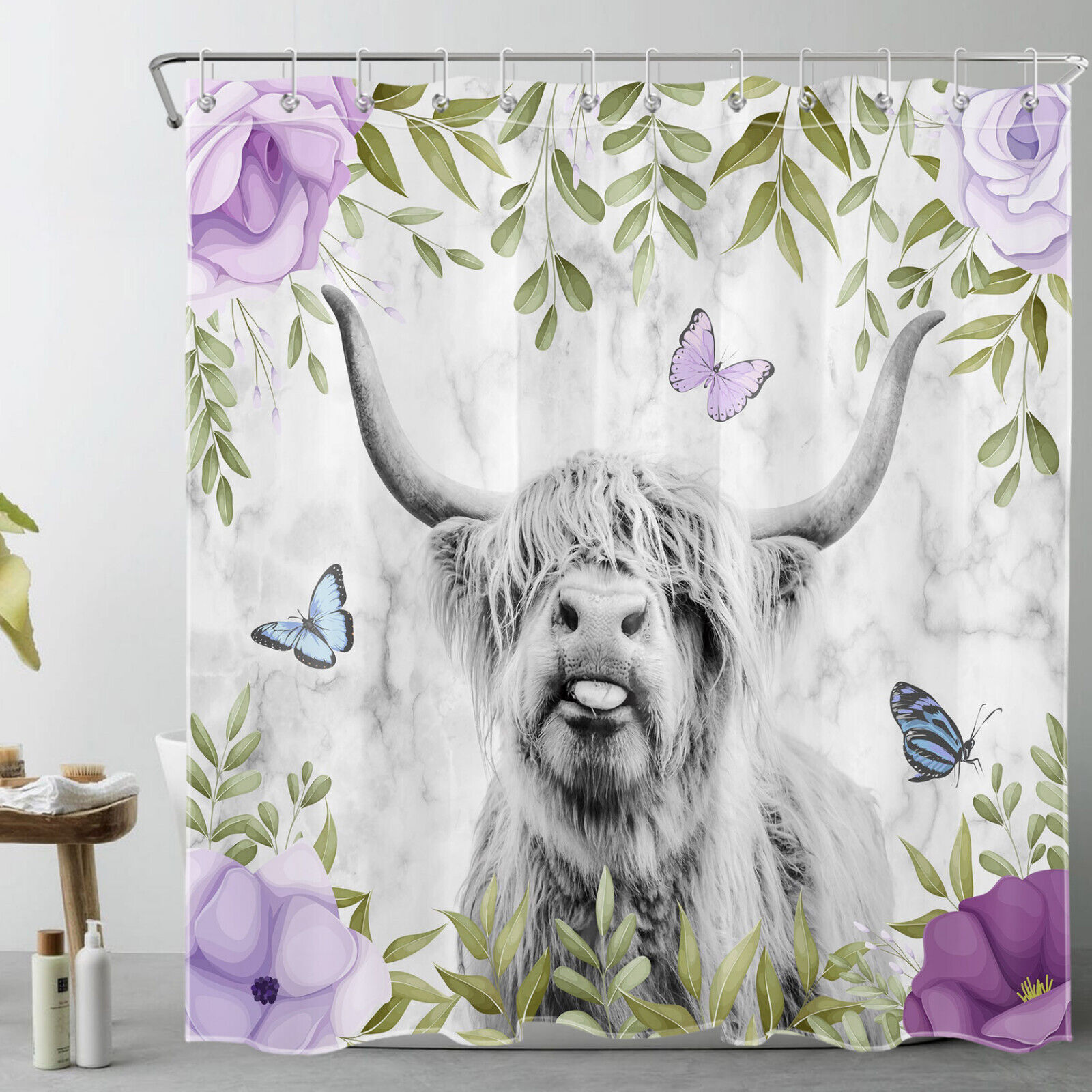 Highland Cow in Marble Texture with Purple Florals – Shower Curtain for Bathroom Decor