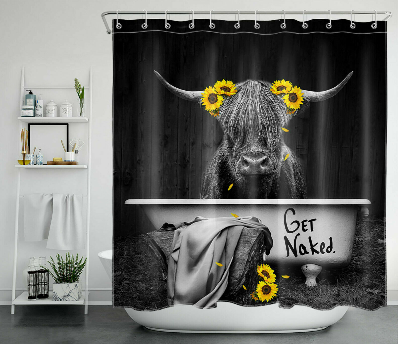 Highland Cow Sunflower Shower Curtain for Farmhouse Bathroom Decor