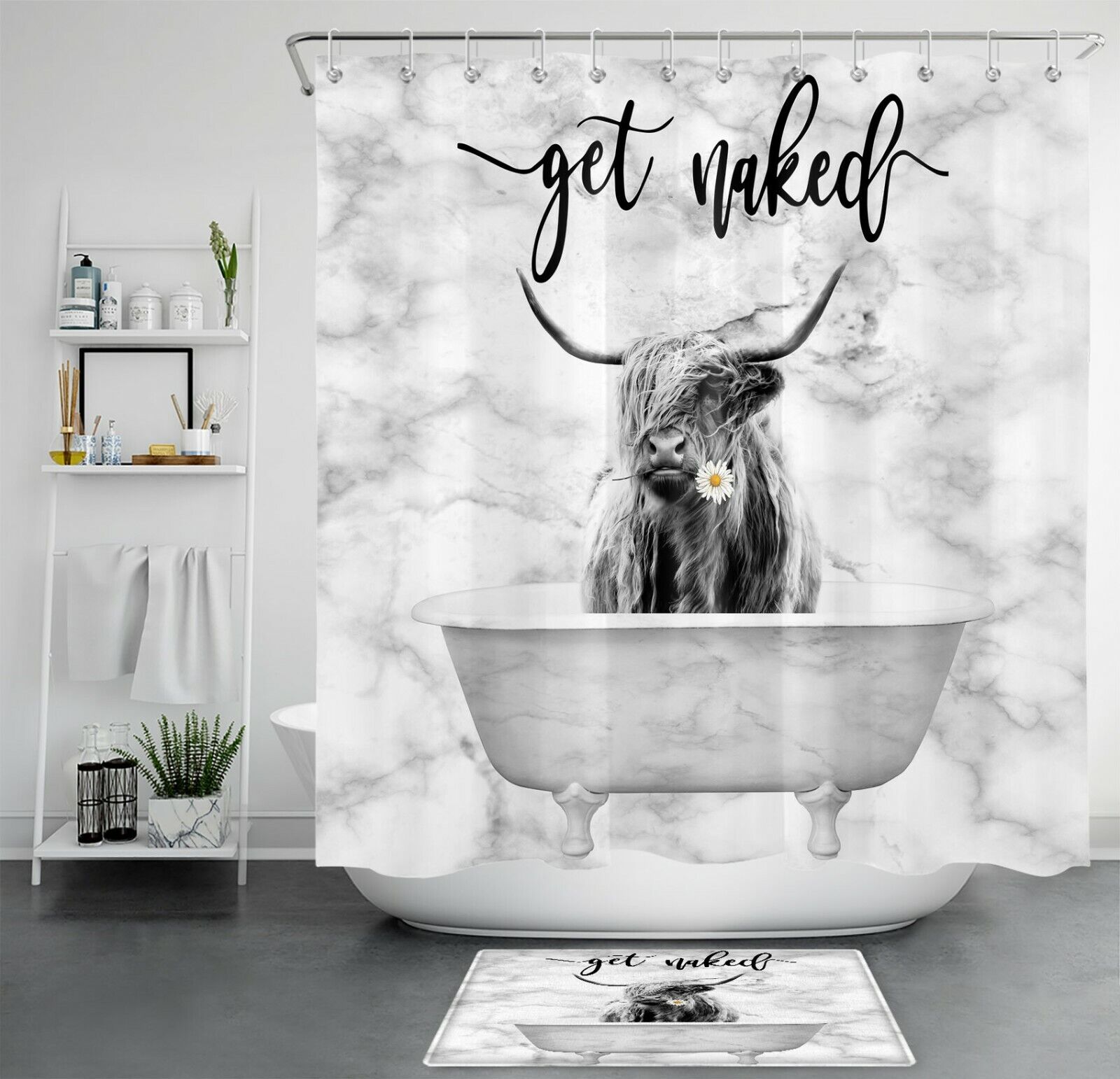 Marble Texture Funny Words Highland Cow Waterproof Shower Curtain