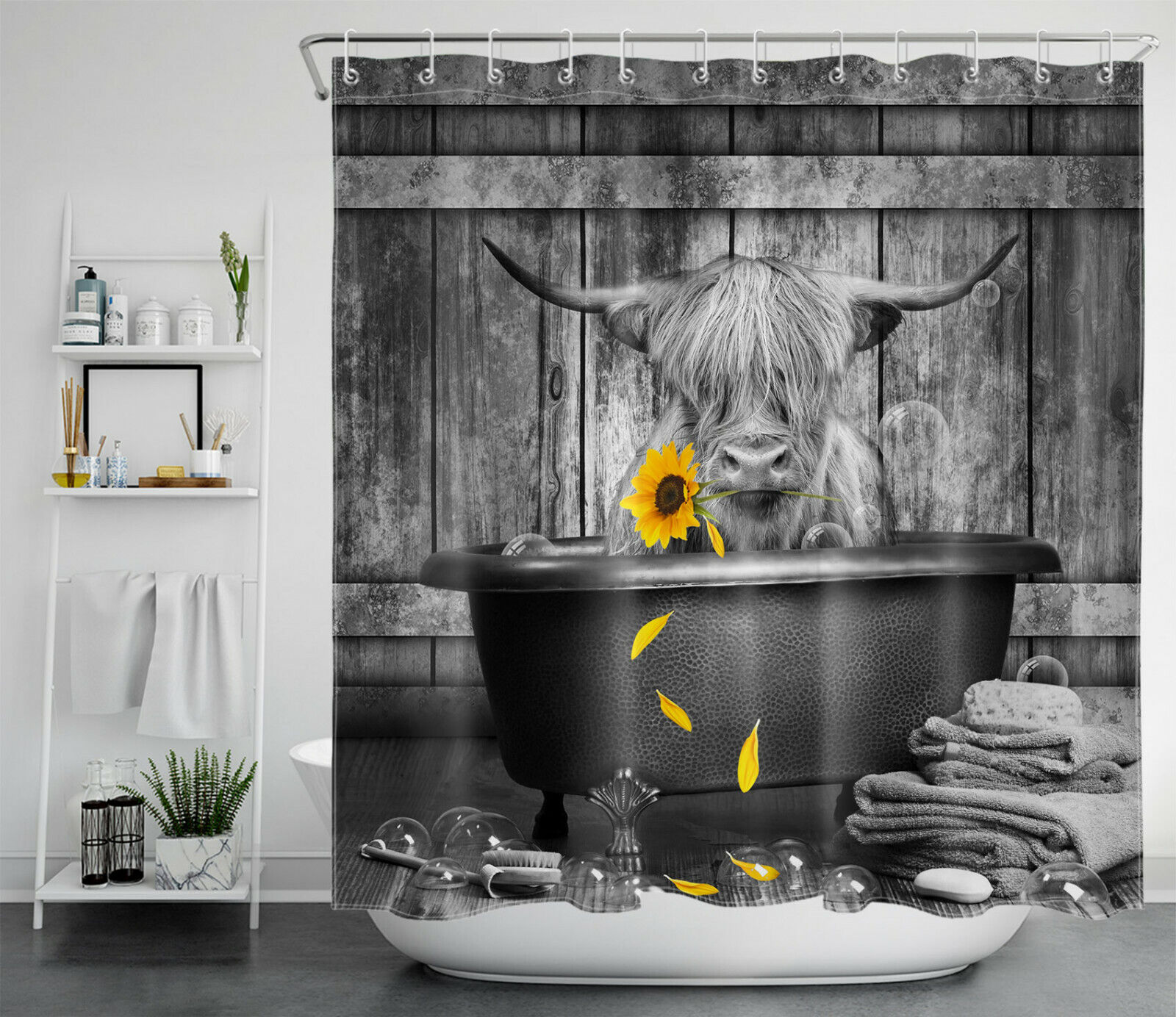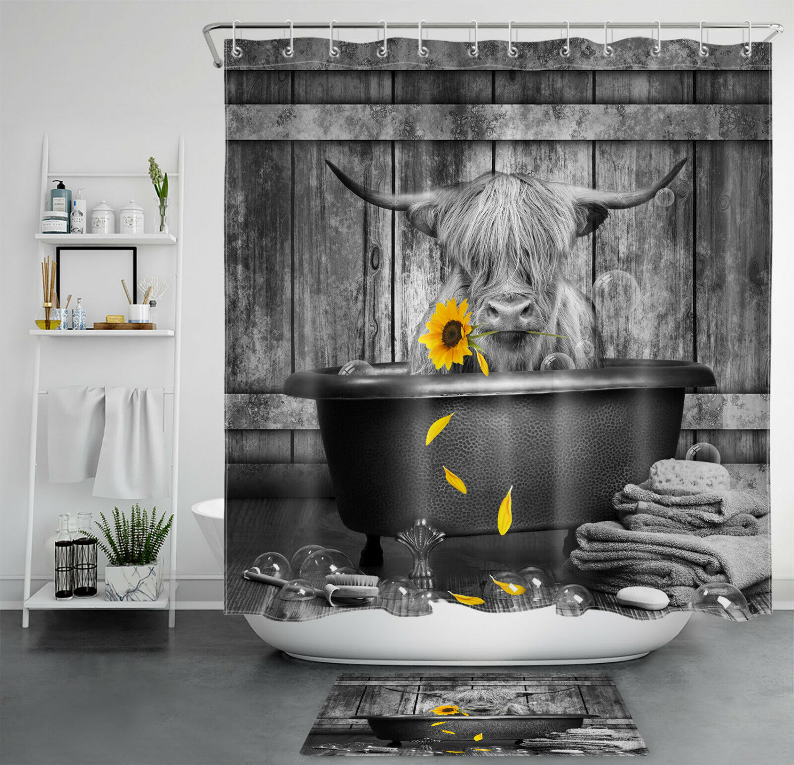 Modern Farmhouse Highland Cow Sunflower Shower Curtain for a Chic and Fun Bathroom