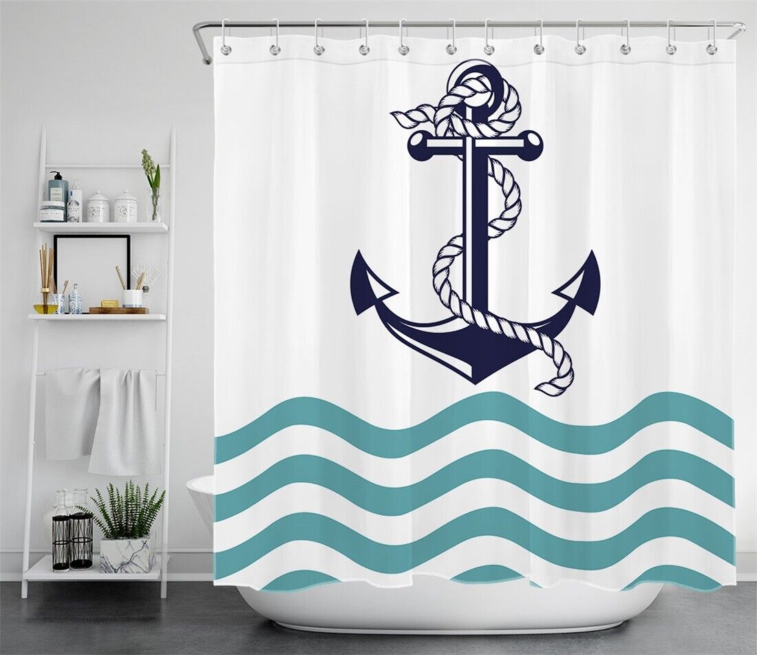 The navy blue anchor against the crisp white background adds a touch of classic maritime charm, making it perfect for those who love the sea and all things nautical. The abstract sea water pattern adds a contemporary twist to the traditional anchor motif, giving your bathroom a modern and artistic appeal.