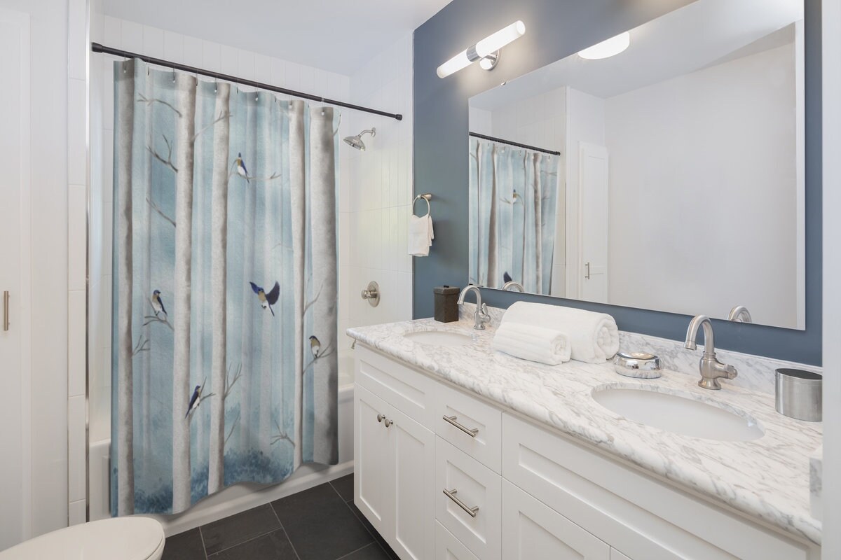 Powder Blue Shower Curtain with Bluebirds in Misty Forest, Print from Original Artwork