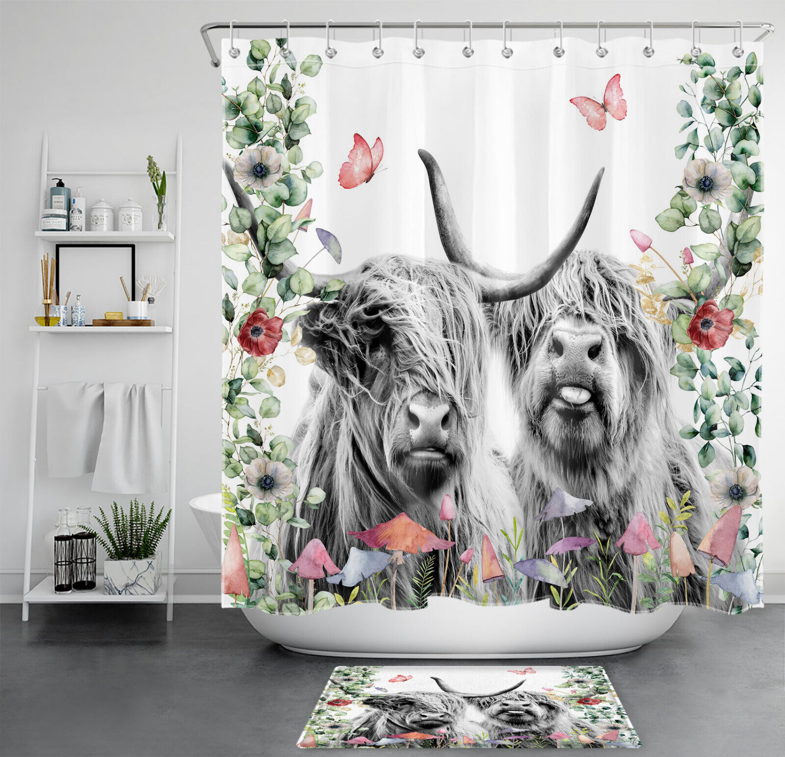 Red Highland Cow Shower Curtain with Floral Mushroom Botanical Print – Bathroom Accessories