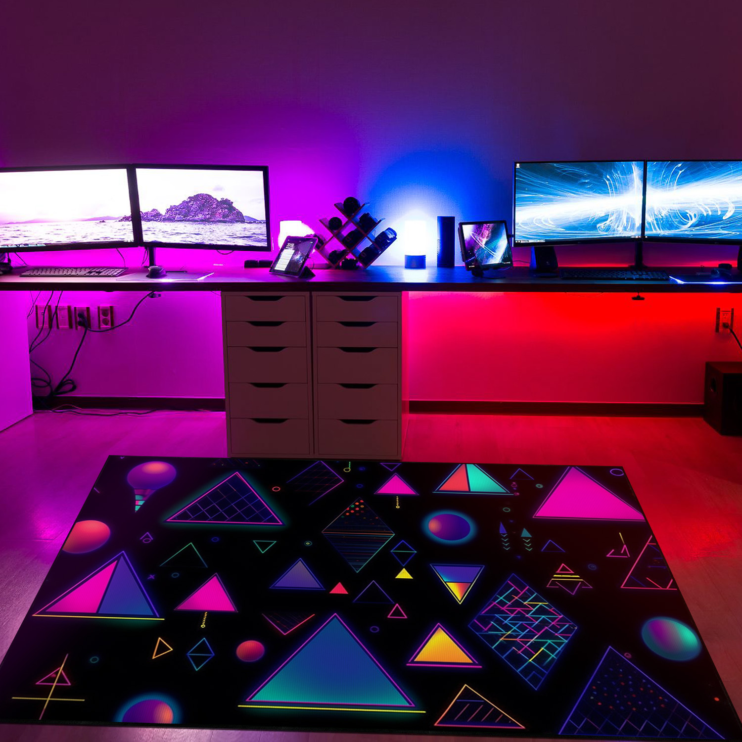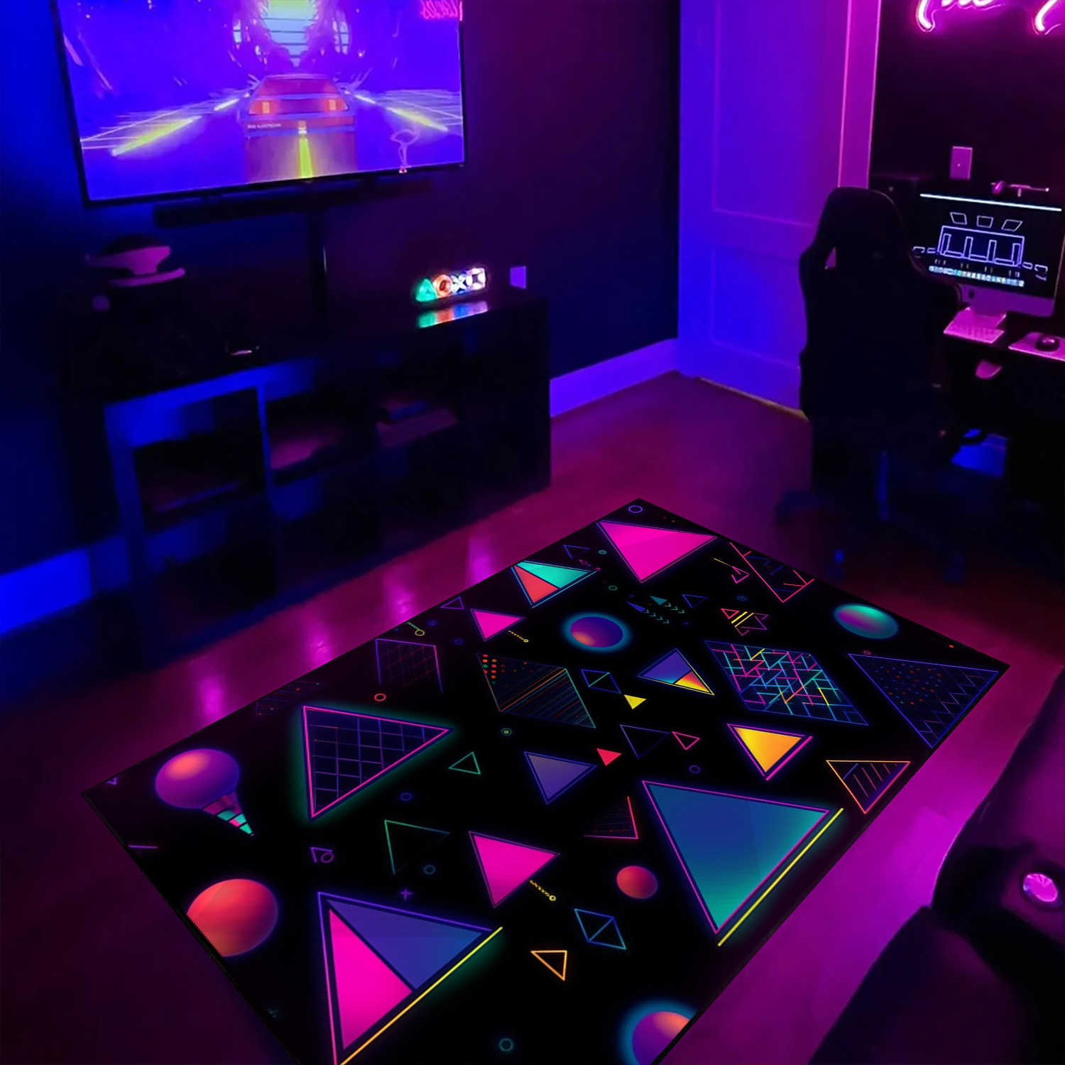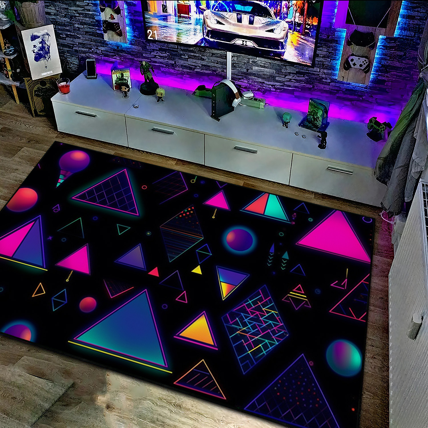 Retro Neon Style Baubles and Triangles Rug – Perfect for a Playful Living Room or Bedroom