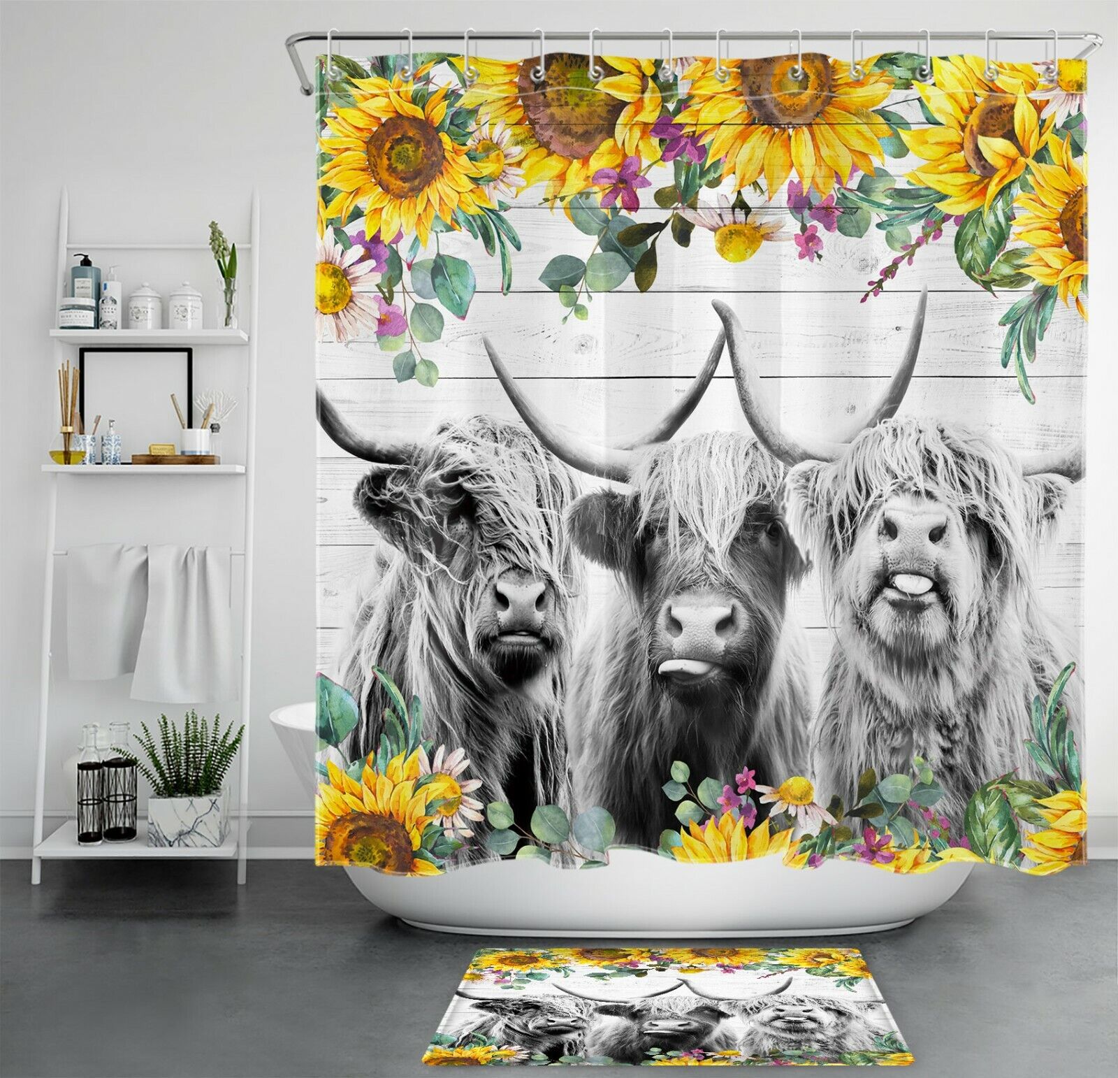 Rustic Board Plant Sunflower Shower Curtain, Highland Cow Bathroom Decor