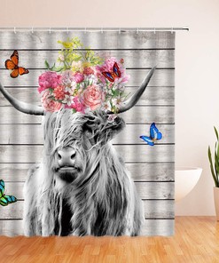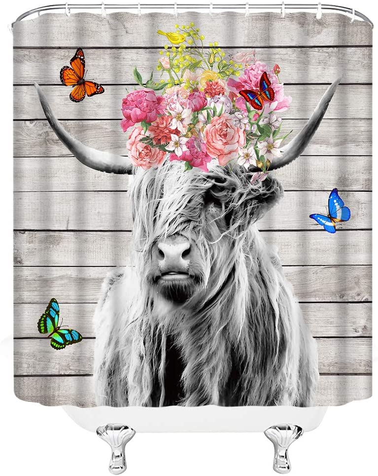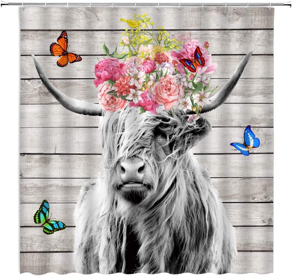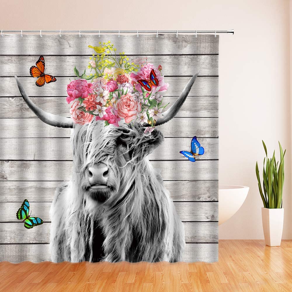 Rustic bull with Butterfly Shower Curtain, Farm Animal Bathroom Decor with Highland Cow