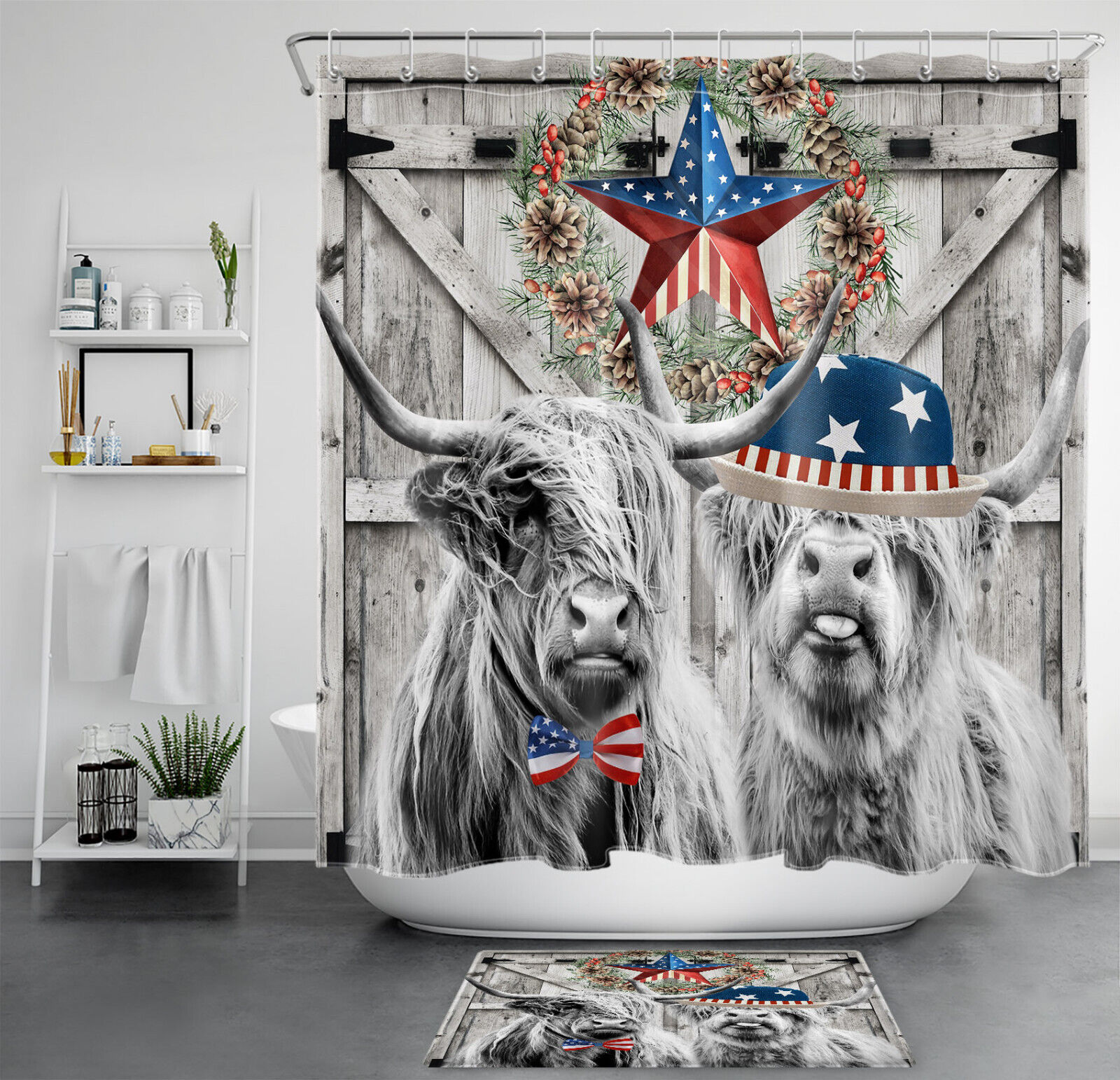 Rustic Wood Barn Patriotic Shower Curtain, Highland Cow Bathroom Decor