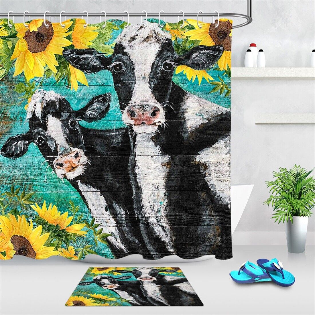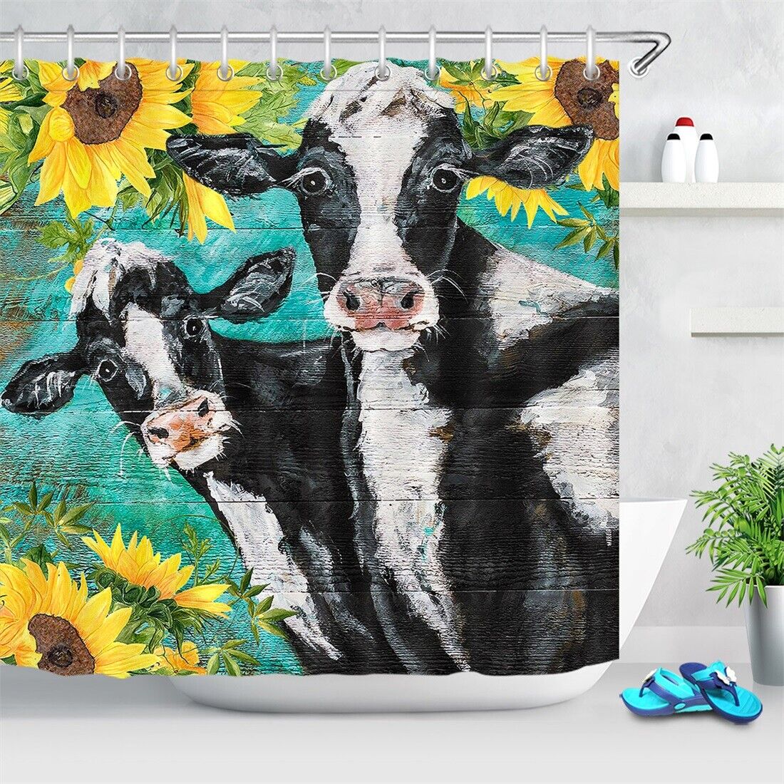Rustic Wood Board Sunflower Funny Cow Shower Curtain for a Farmhouse Bathroom Decor with a Touch of Whimsy