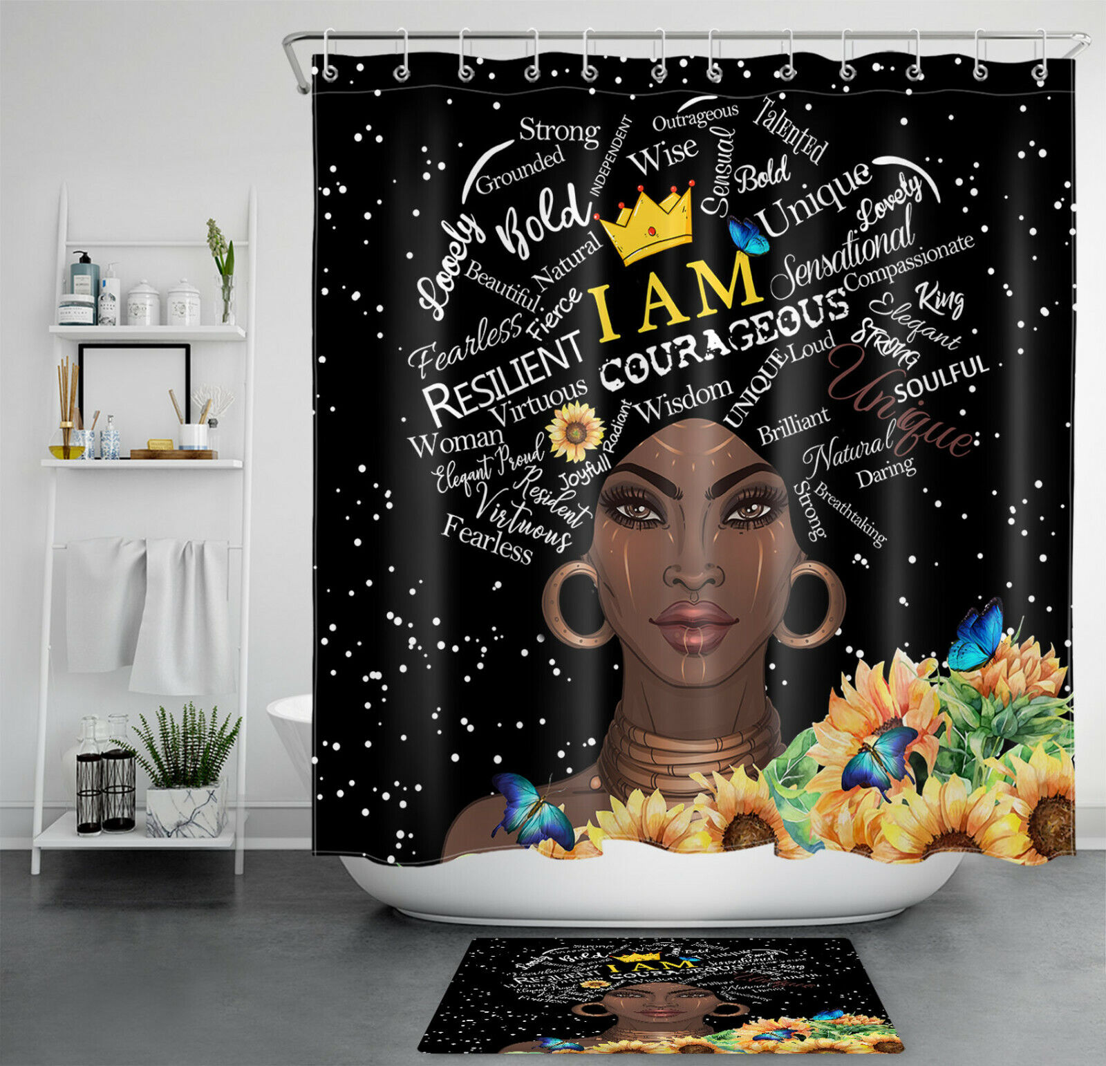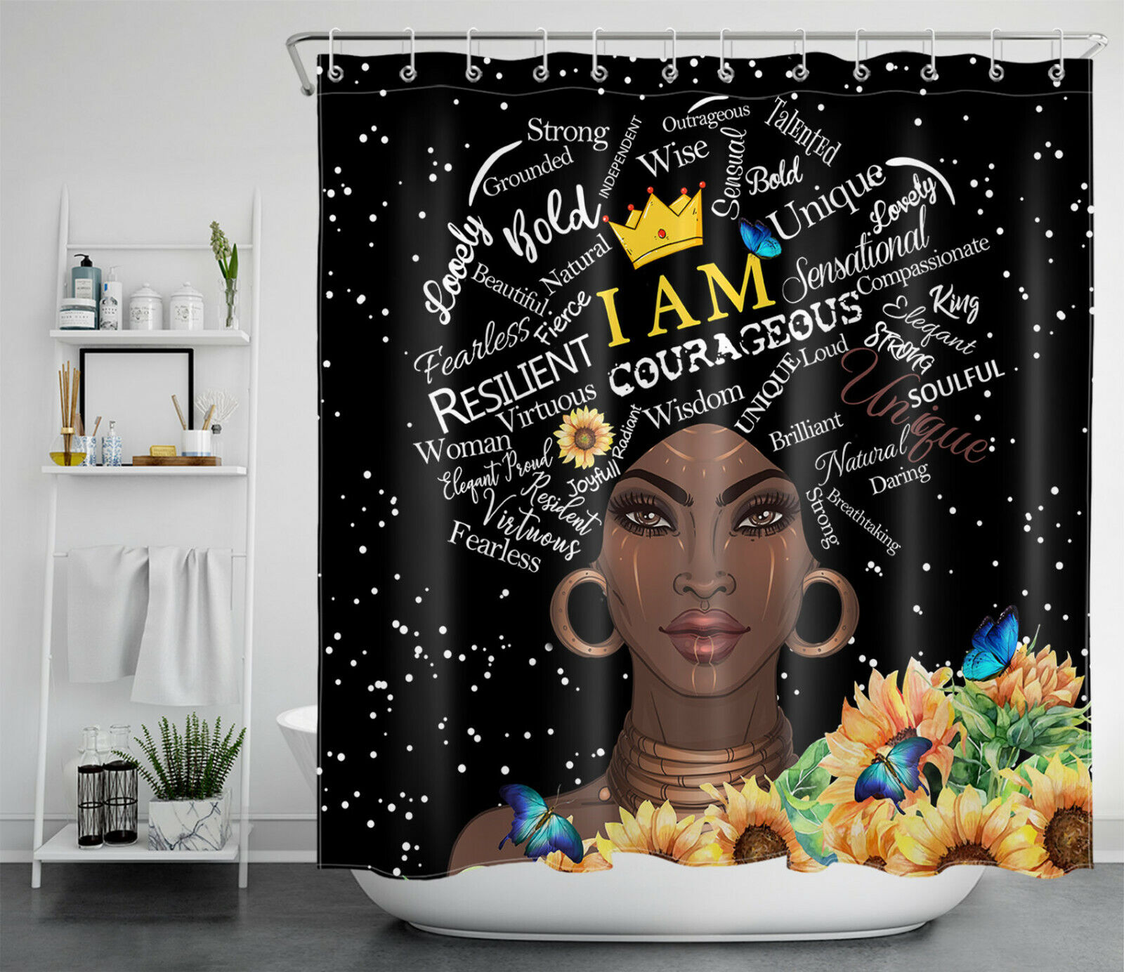 This shower curtain is the perfect way to add a touch of African flair to your bathroom. It is also a great way to celebrate the beauty and strength of African-American women. The vibrant colors and patterns will brighten up any bathroom, and the inspirational message will leave you feeling empowered every time you take a shower.