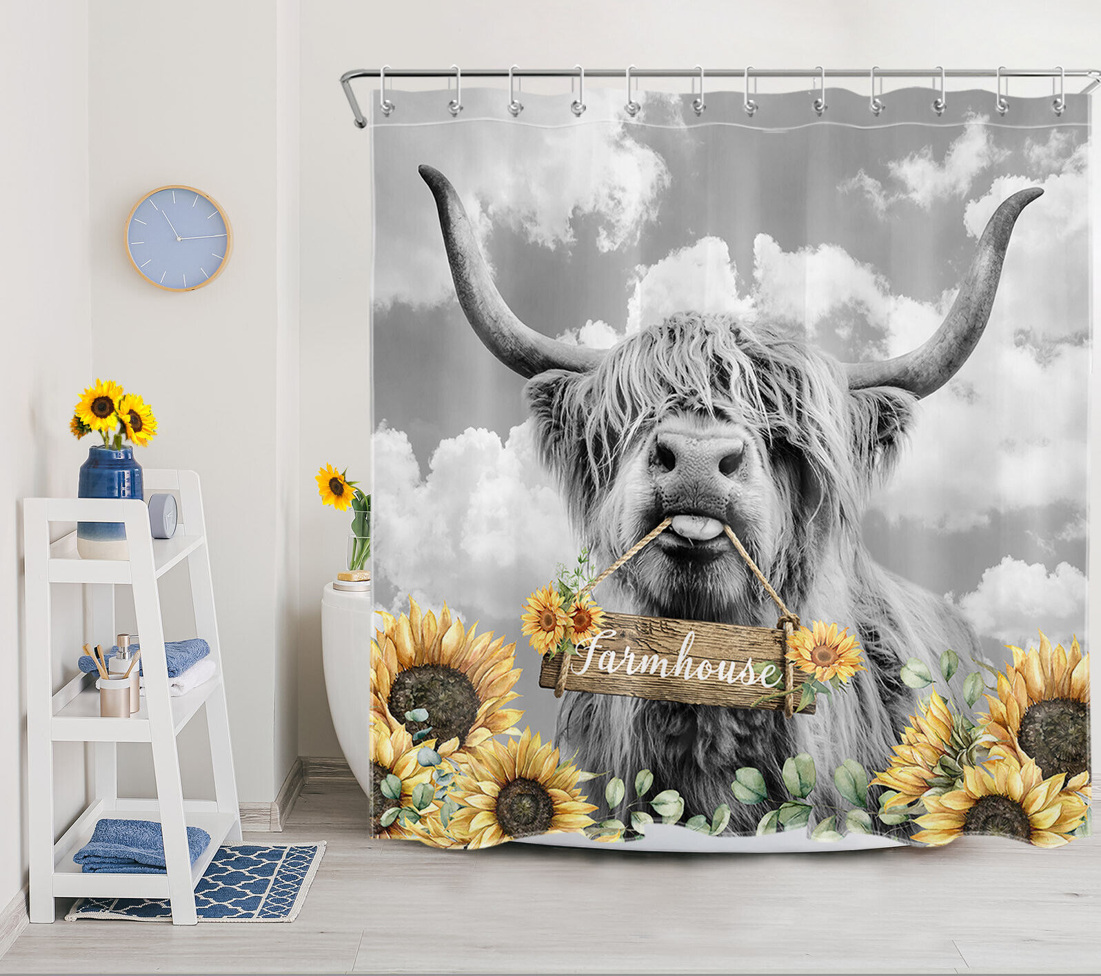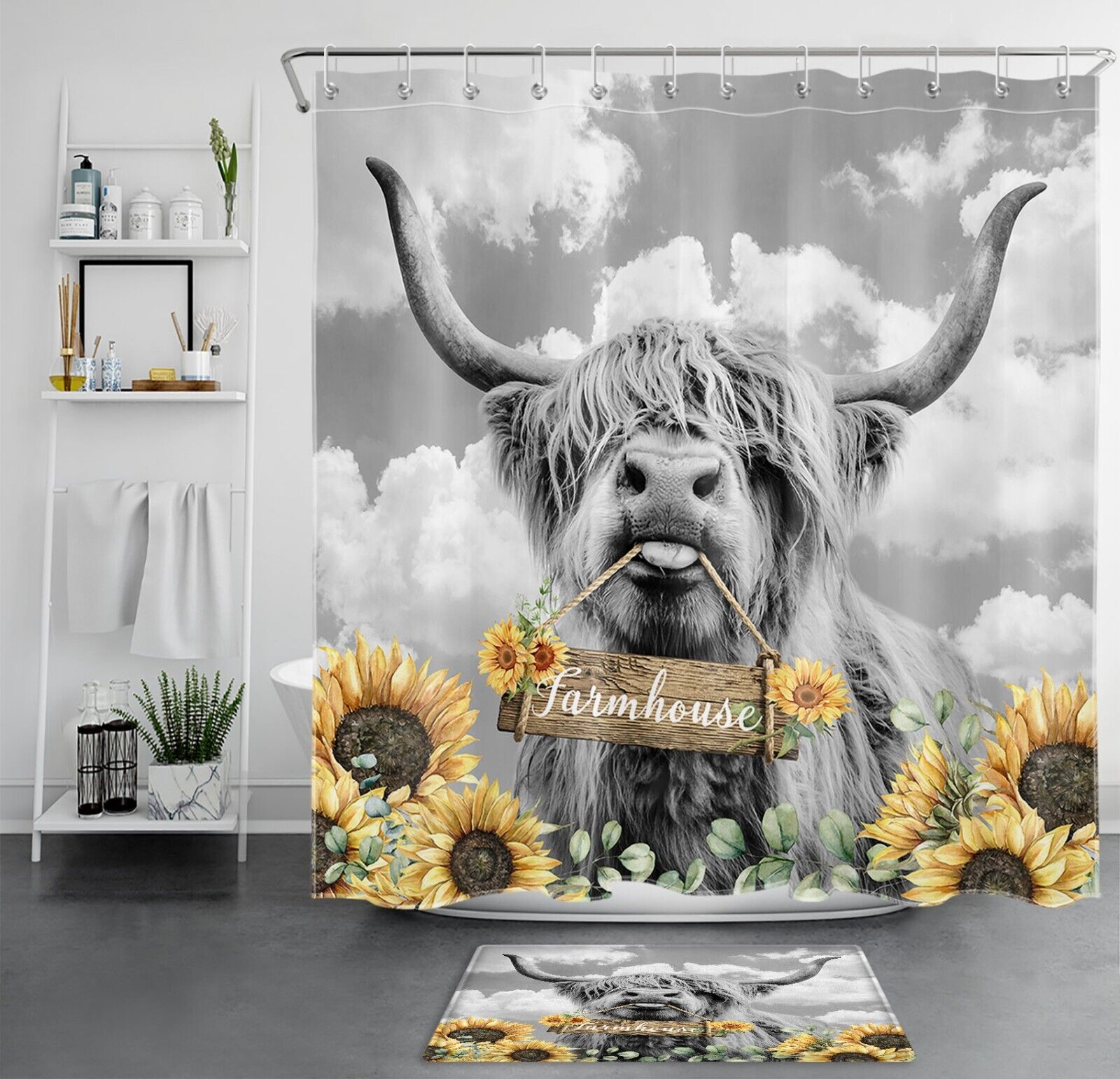 Sunflower Shower Curtain with Highland Cow Print for a Rustic Farmhouse Bathroom