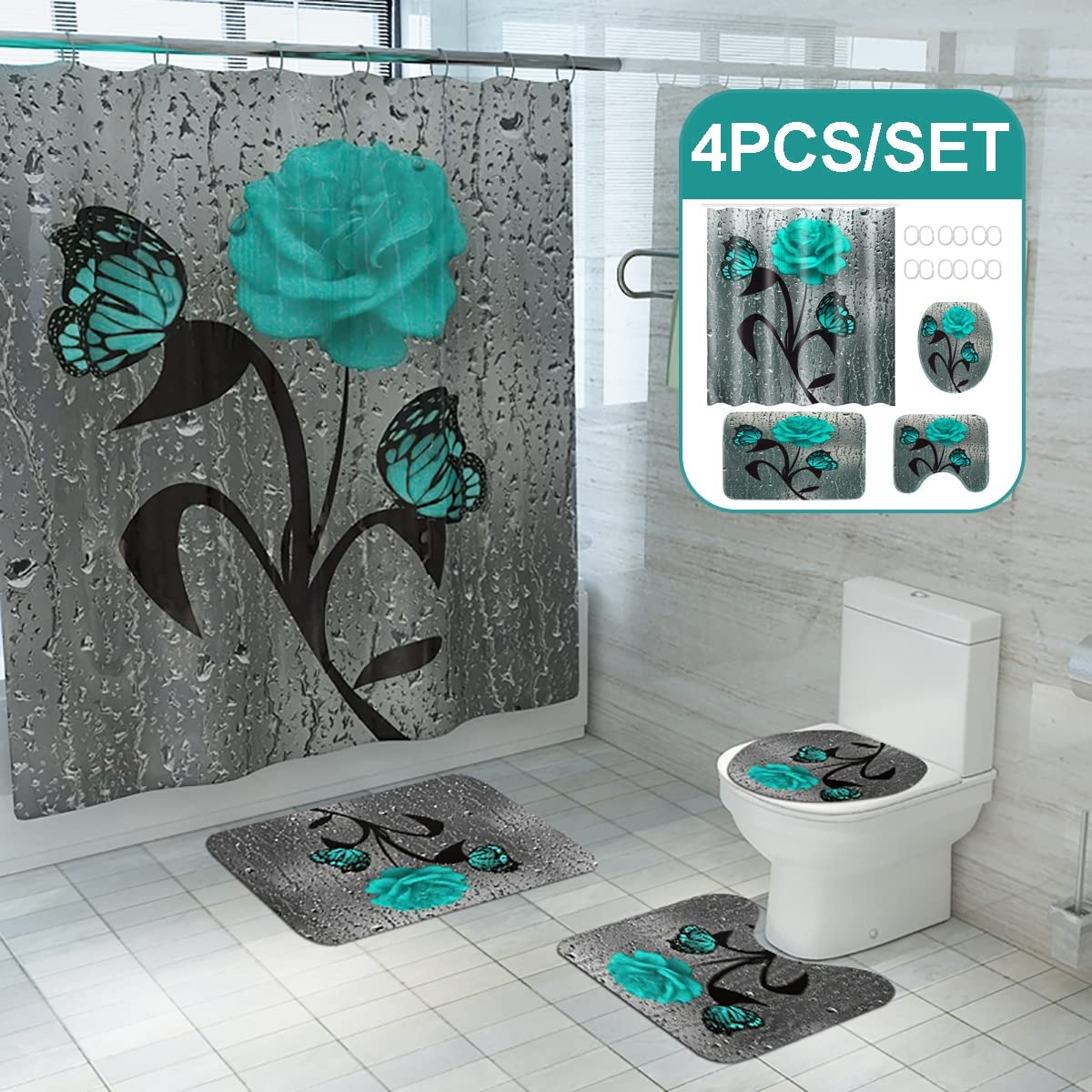 Teal Rose Flower & Butterfly Shower Curtain Set for Floral Bathroom Decor