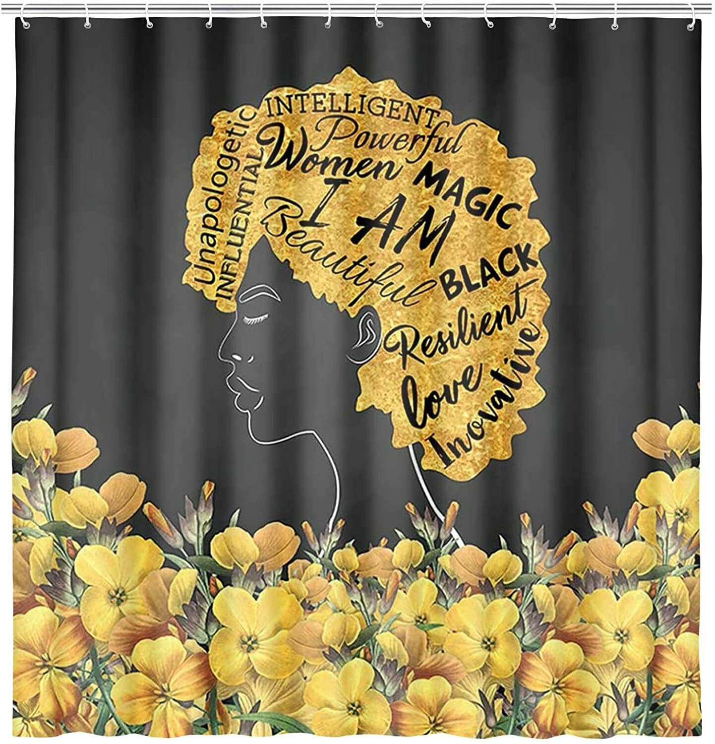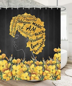 This beautiful black shower curtain features a vibrant yellow flower design with an African-American woman in the center. The flowers are arranged in a cascading pattern, creating a sense of movement and energy. The overall effect is a stunning and unique shower curtain that will add a touch of sophistication and style to any bathroom.